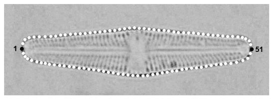 Two monoclonal strains of the raphid diatom Luticola poulickovae Levkov, Metzeltin & A. Pavlov (strains LUTM 59: Luticola 1; and LUTM 48: Luticola 2 []) were used in this study. Both strains were cultivated for over a year to capture the entire size range of the cells throughout the life cycle, as described in our previous study []. The strains were cultivated in liquid WC medium [] at 18 °C in 7 cm diameter Petri dishes and illuminated at 40 µmol·m−2·s−1 by 18-W cool fluorescent tubes (Phillips TLD 18W/33, Amsterdam, The Netherlands). The medium was exchanged weekly to avoid nutrient depletion, and approximately 10% of the cells were transplanted to new Petri dishes monthly in order to avoid overcrowding. Samples were collected from the cultures and processed for light microscopy analysis every second month []. Permanent slides were made from the samples [,], with micrographs of 50 valves captured from each permanent slide (i.e., a sample corresponding to a certain life-cycle stage in a culture) using an Olympus BX-51 light microscope (Olympus Corporation, Tokyo, Japan) fitted with an Olympus Z5060 digital camera. The digital micrographs were compiled in Adobe Photoshop CS3 version 10.0 (Adobe Adobe Systems Incorporated, San Jose, CA, USA), and mixed together resulting in one set of micrographs for each strain containing a whole size range of the population. Then, valves were randomly chosen for statistical analyses (75 valves of Luticola 1, 72 valves of Luticola 2). The shapes of the valves were registered in TpsDig, version 2.26 []. In total, 100 landmarks were positioned along the valve outline. Two landmarks were in fixed positions (numbers 1 and 51: intersection of the valve outline with the apical axis), with the remaining 98 landmarks allowed to slide along the outline between the fixed landmarks (2–50; 52–100), (Figure 2).