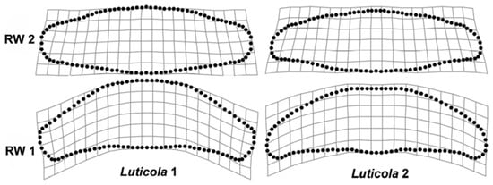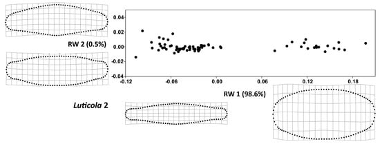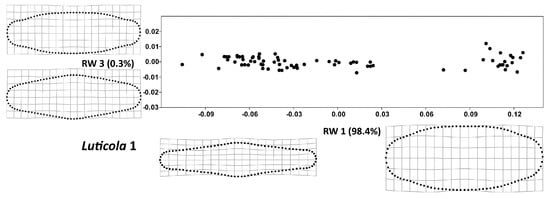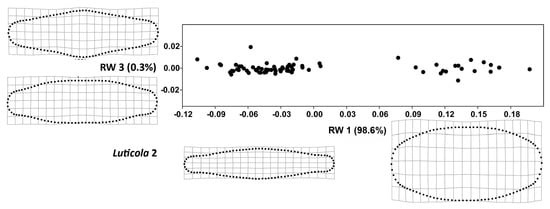 The RW 1 axes (Figure 3 and Figure 4) accounted for more than 98% of variability in both strains. The valve shape along the RW 1 axis varied between narrow valve outlines with a broad, rounded central area and round outlines with less pronounced undulations, a trend that was similar in both strains. At the same time, the shape variation of the examined strains, described by RW 2 and RW 3, differed slightly; in Luticola 1, RW 2 (Figure 5) corresponded to asymmetry along the apical axis of the valves, whereas in Luticola 2 (Figure 6), this asymmetry was also accompanied by broadness of the central area of the valves. In Luticola 1, RW 3 represented the variability of valve outlines with broad central areas, and outlines with relatively narrow central areas and round apical parts, whereas in Luticola 2, the shape along RW 3 varied between valve outlines with broad and round central areas with relatively wide apical parts and outlines with straight, almost tapered central areas.