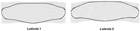 FA shape trends in the strains Luticola 1 and Luticola 2 represented by four times magnified thin-plate splines.