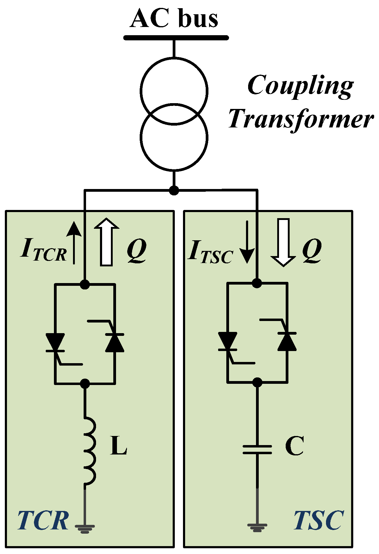 Static VAR systems are applied by utilities in transmission applications for several purposes. The primary purpose is usually the rapid control of voltage at weak points in a network. Installations may be at the midpoint of transmission interconnections or at the line ends for compensation of irregular load, voltage, and source power factors in the power system. SVCs are shunt connected static generators/absorbers whose outputs are varied to control the voltage and power factor of the electric power systems. In its simple form, an SVC is connected as a thyristor switch capacitor-thyristor controlled reactor (TSC-TCR) configuration, as shown in Figure 1. The SVC is connected to a coupling transformer that is connected directly to the AC bus whose voltage/power factor source is to be regulated.