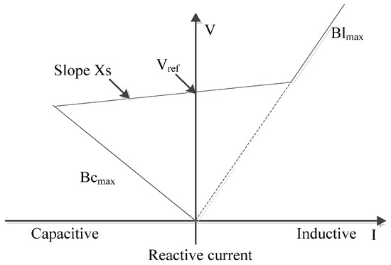 The SVC can be operated in two different modes: voltage regulation mode (where the voltage is regulated within limits as explained below) and VAR control mode (where the SVC susceptance is kept constant). When the SVC is operated in voltage regulation mode, it implements the following V-I characteristics. SVC steady-state control characteristics in its simple form are shown in Figure 2. As long as the SVC susceptance B stays within the maximum and minimum susceptance values imposed by the total reactive power of capacitor banks (Bcmax) and reactor banks (Blmax), the voltage is regulated at the reference voltage Vref. However, a voltage drop is normally used (usually between 1% and 4% of the maximum reactive power output), and the V-I characteristic curve has the slope indicated in Figure 2.