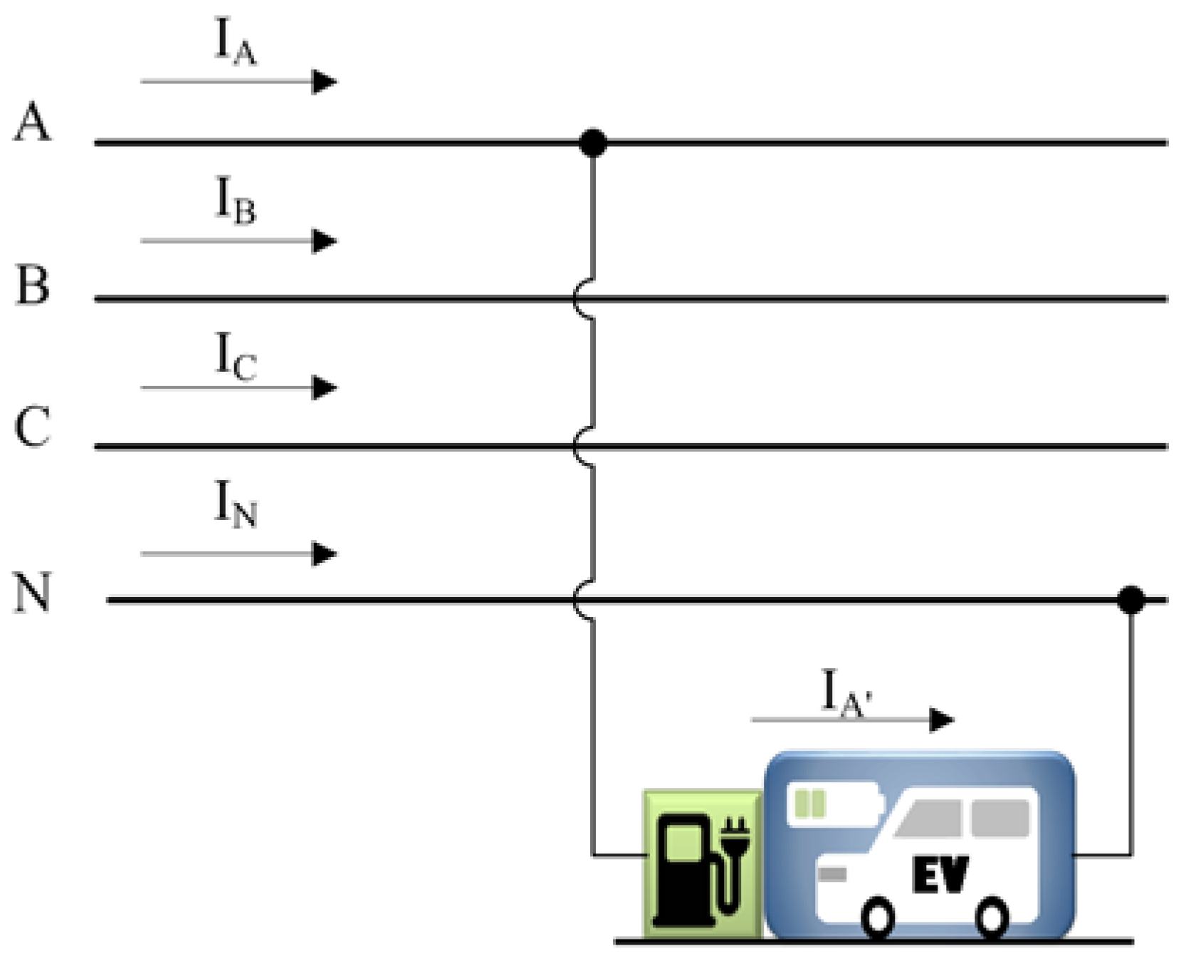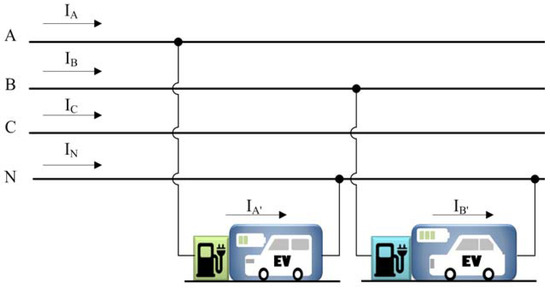 EVs connected to three single-phase voltages (Figure 5) can often be found in low voltage (LV) networks in residential areas. Three-phase connected loads are symmetrical, and can only operate as asymmetrical in the case of failure (for a certain period of time). The three-phase load’s neutral may or may not be connected with the transformer’s neutral.