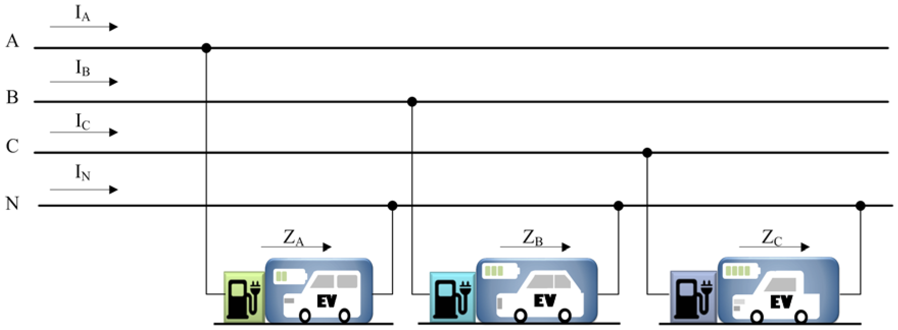 EVs are connected to three single-phase voltages.