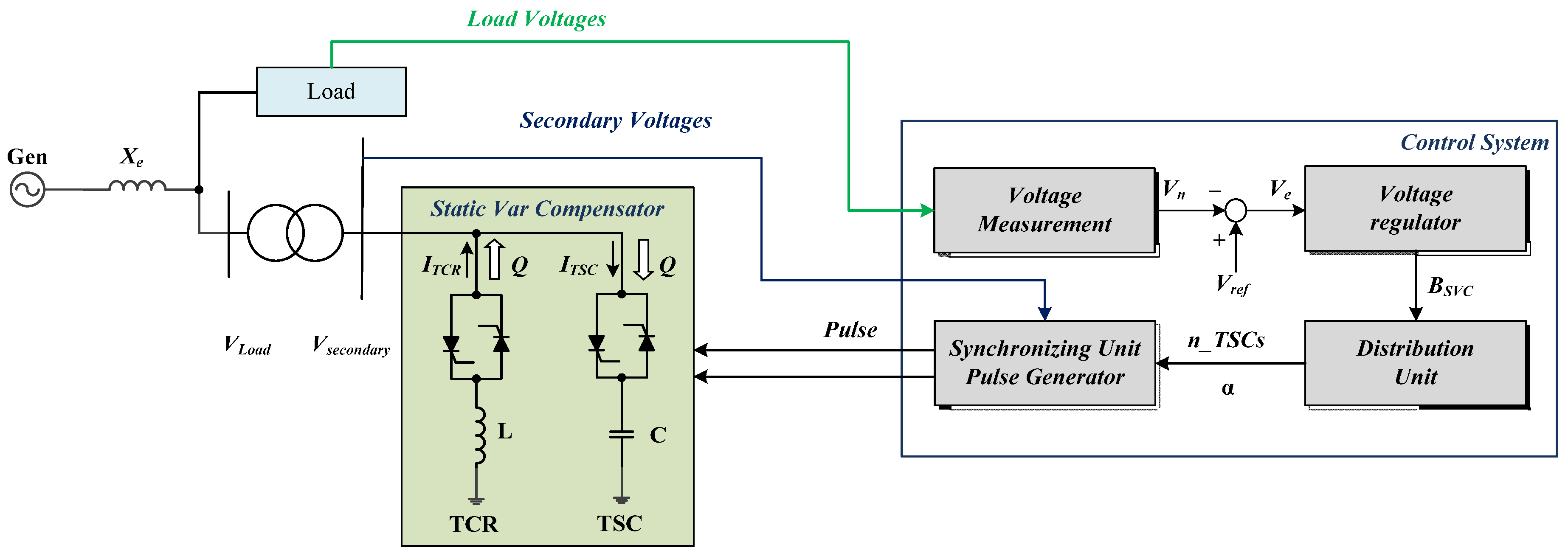 The control objective of the SVC is to maintain the desired voltage in a high voltage bus. In steady state, the SVC will provide some steady-state control of the voltage to impound it the highest condition at a pre-defined level. When the load is changed in the power system, the power factor is decreased. For improvement of the power factor, the SVC will inject reactive power into the system (within its control limits) to increase the power factor of the system.