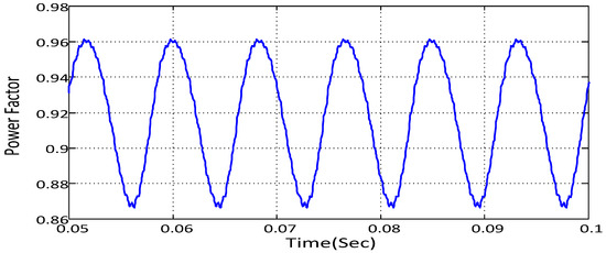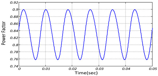 As can be seen in Figure 8, the average power factor of the system is 0.83 or 83%, and the upper and lower distortion in the power factor curve is 0.14 or 14%. For improvement of the power factor, an SVC is suggested for this system. After putting an SVC in the system (Figure 7), the power factor of the system is improved. Figure 9 illustrates the power factor of the system when EVs are plugged into the grid with an SVC.