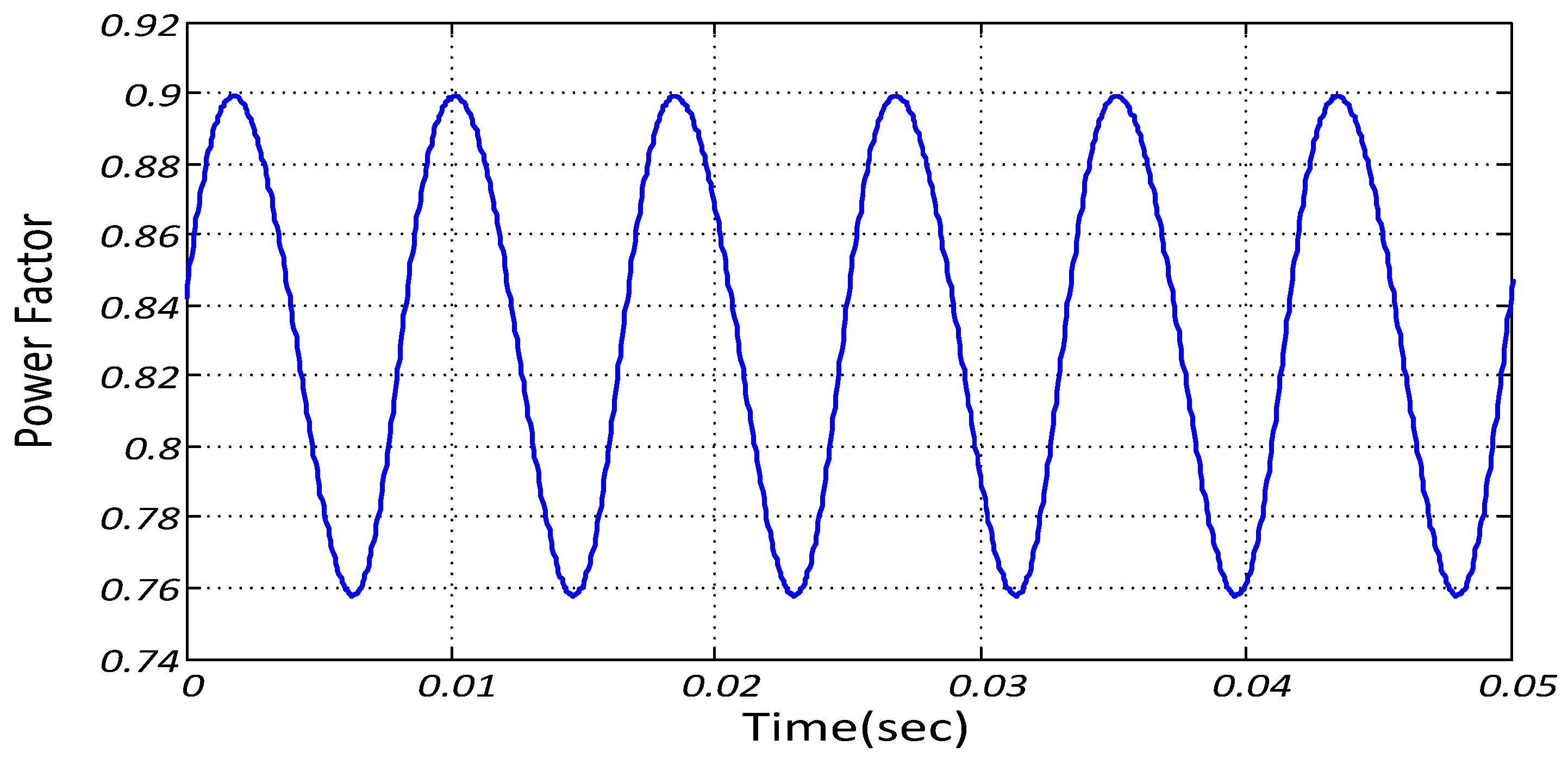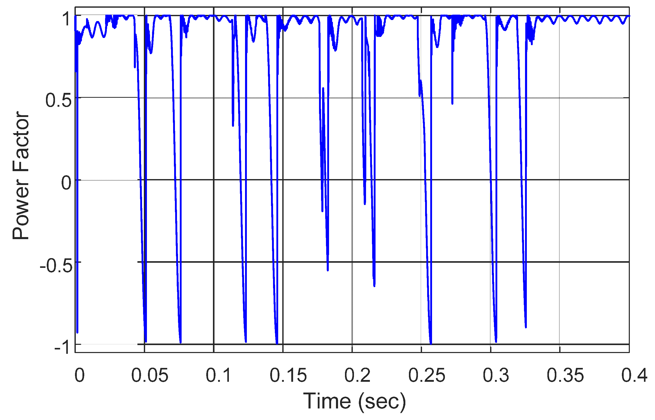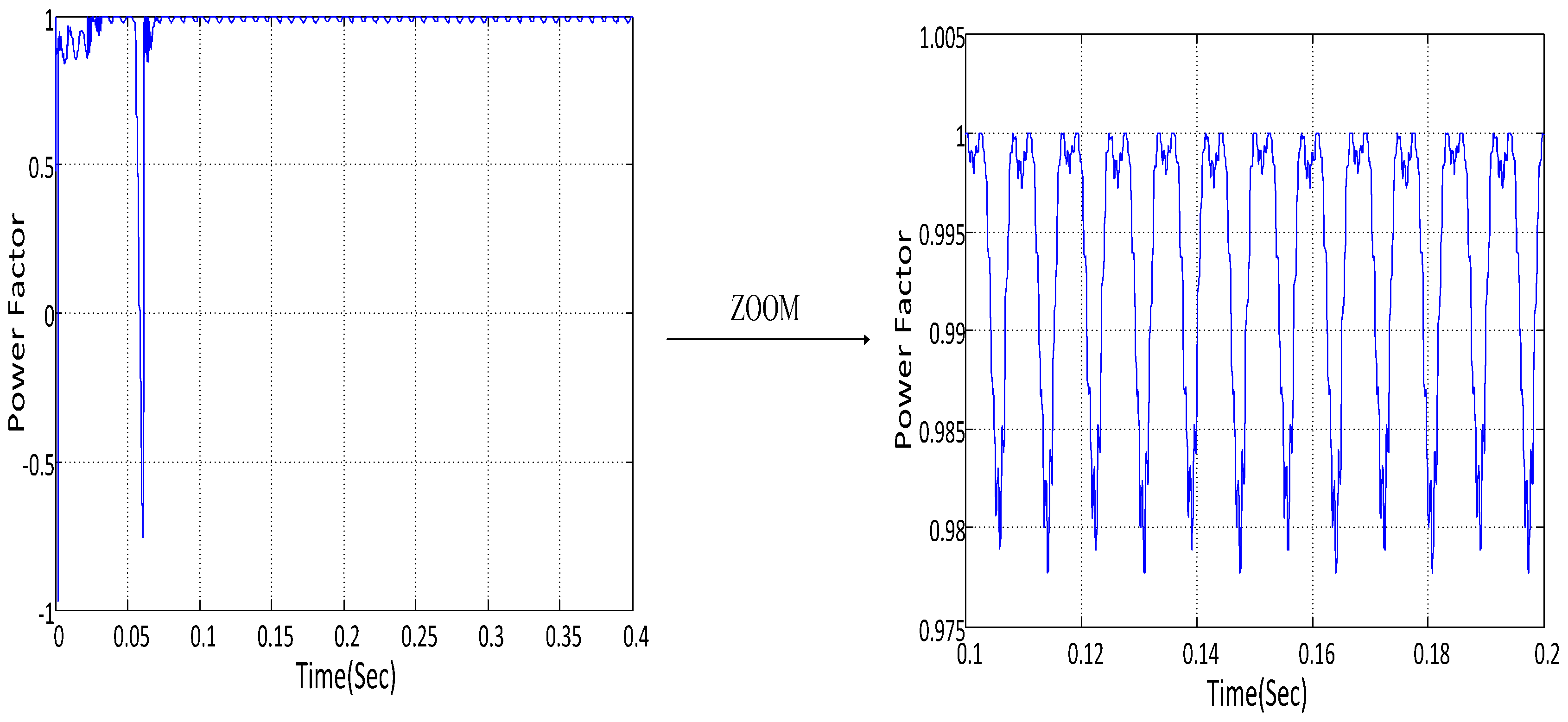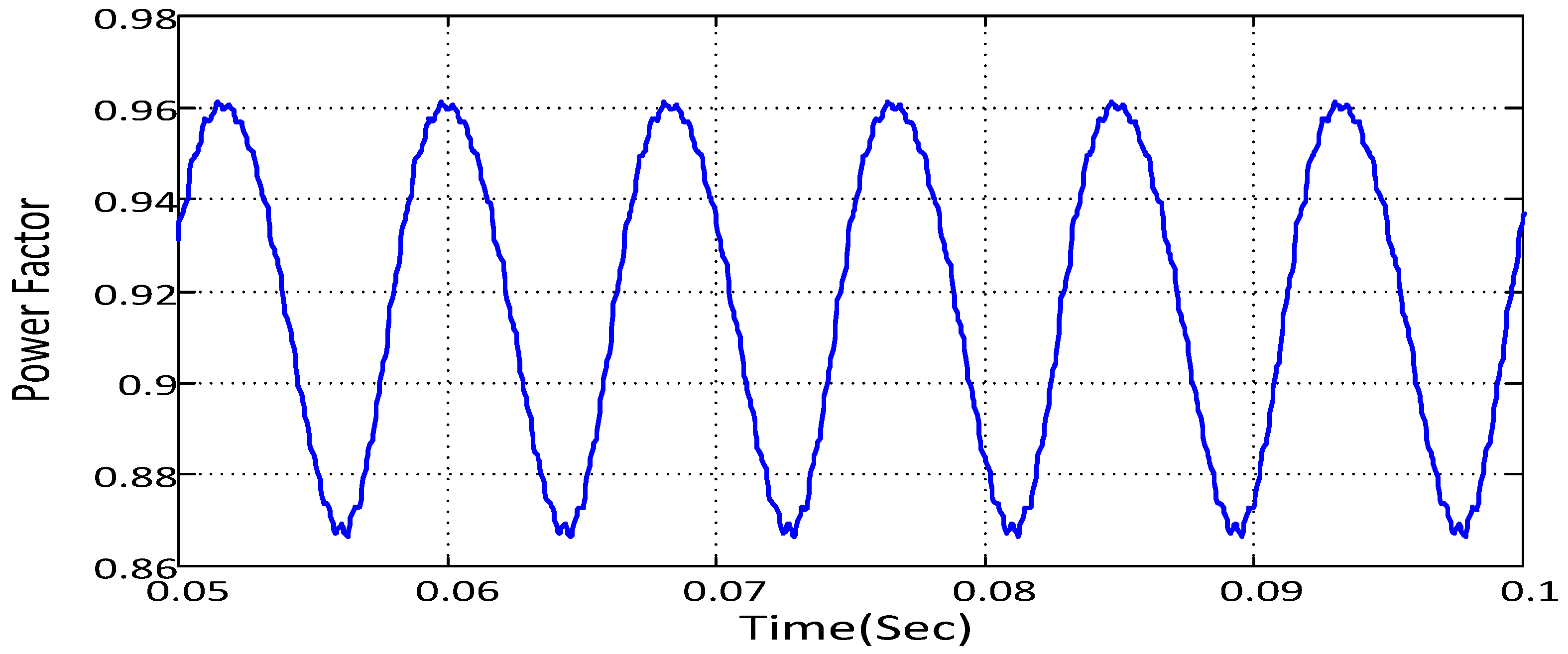 As can be seen in Table 2, when using the proposed controller, the average power factor is increased by 16%, and the interval of the upper and lower power factor is reduced by 2%.
