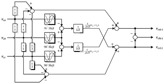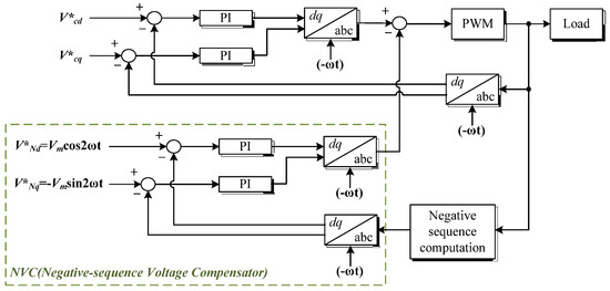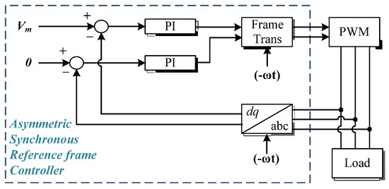 Figure 10 shows the structure of ASRF-PI voltage controller. The objective of this controller is to maintain the three-phase voltage at a certain magnitude, regardless of the loading condition have shown the feasibility of an ASRFC, which can eliminate the effects of both non-linear and unbalanced loads if each strategy is combined. Figure 11 shows a concept of an ASRFC for unbalanced load compensation [21,28,30]. The negative sequence controller in the scheme compensates the negative voltage distortion due to unbalanced load with the asymmetric synchronous reference frame rotating at the fundamental frequency in the opposite direction to the positive sequence.
