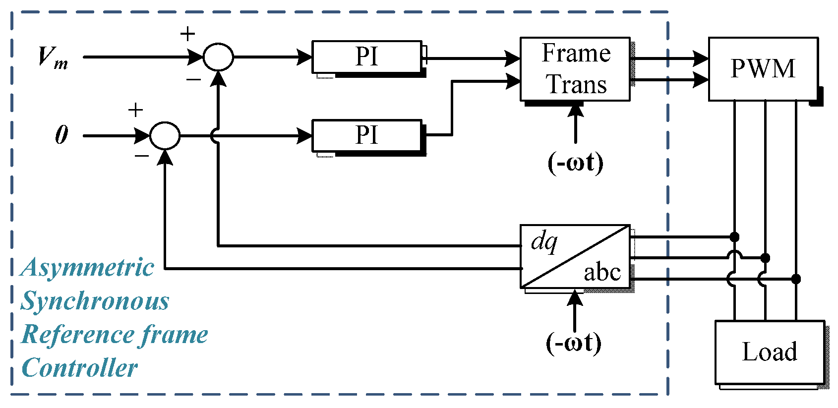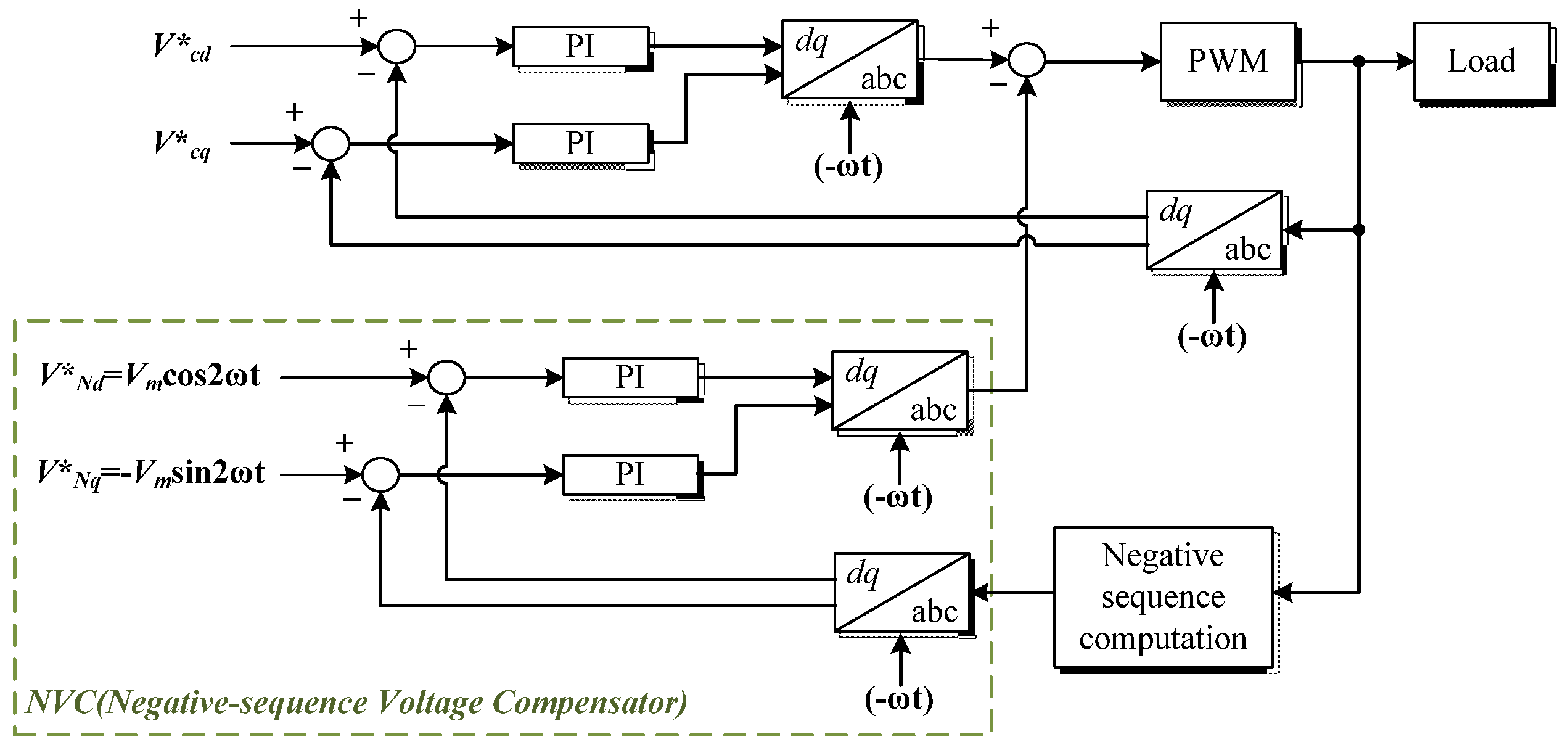 Thus, fundamental components of the output voltage will become DC quantities in the negative sequence reference frame dq. With a parallel controller in dq, the negative sequence distortion can be attenuated or even eliminated if an integral controller is used.