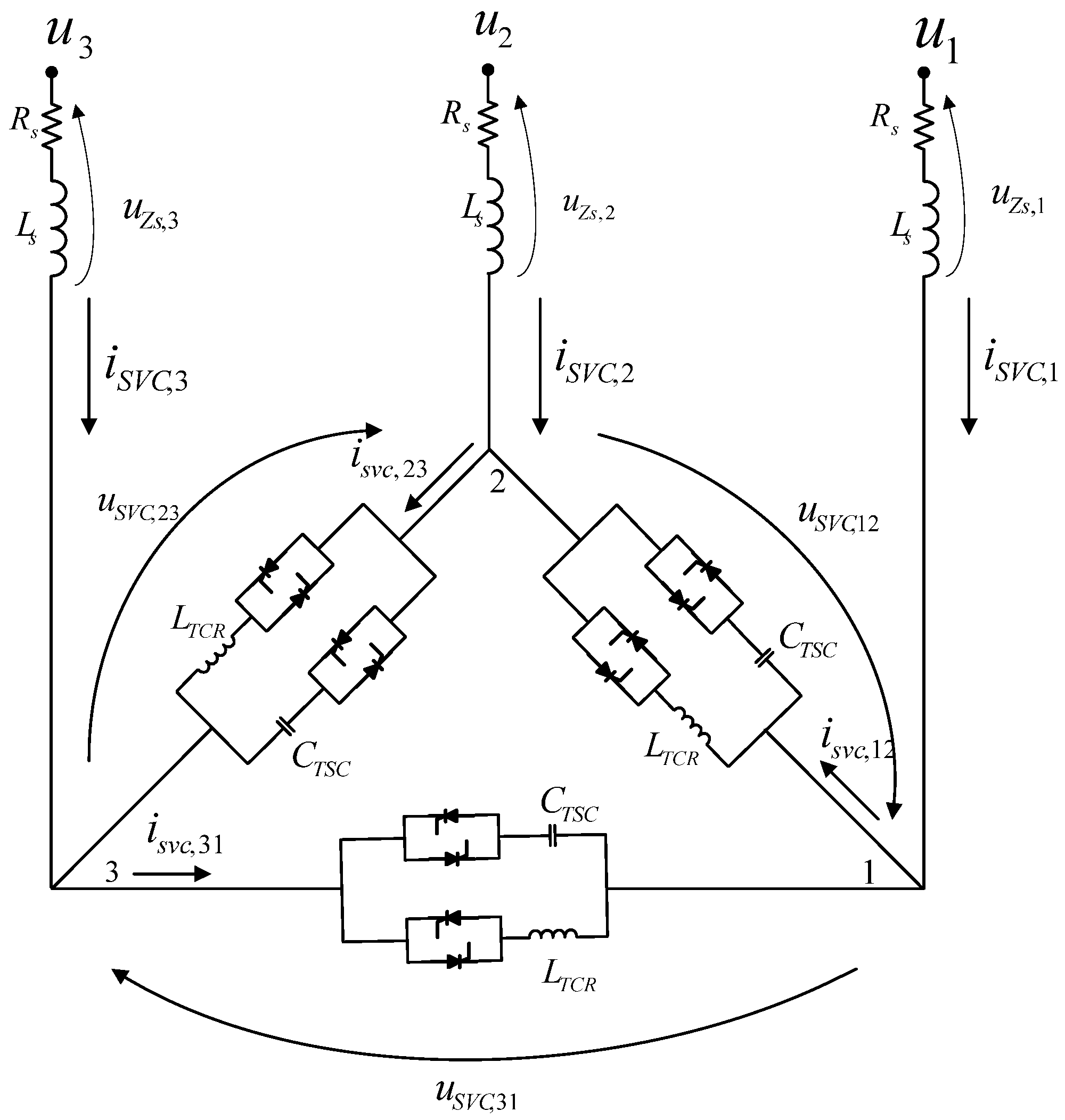 By using the superposition theorem, the current of the SVC branches mn = 12, 23, 31 can be split into and in order to determine each of these components separately. Therefore, the current of each RSC branch can be expressed by: