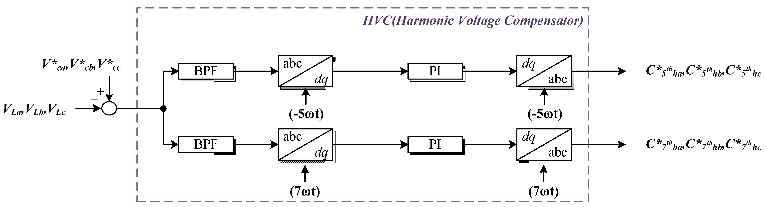 The HVC in the proposed scheme is designed to compensate the selected harmonic voltage distortion due to nonlinear loads. The scheme shows a sample of 5th and 7th harmonic compensation the symmetrical balanced harmonic component of the output voltage can be obtained by a dedicated bandpass filter with characteristic frequency corresponding to the selected harmonic frequency to be compensated. The bandpass filters in the scheme output symmetrical balanced sets of the 5th and 7th harmonic components, which can be transformed into DC quantities by the Park transformation. Likewise, PI controllers in HVC are used with pure DC control variables, which can provide zero steady-state errors for a selected harmonic frequency. The HVC does not require knowledge of the system parameters, the leading angle to compensate for system delay with an LC filter, or a fast switching frequency. In conclusion, the NVC and HVC operate as feed-forward controllers for the compensation of voltage distortion. Figure 16 shows the HVC’s block diagram.