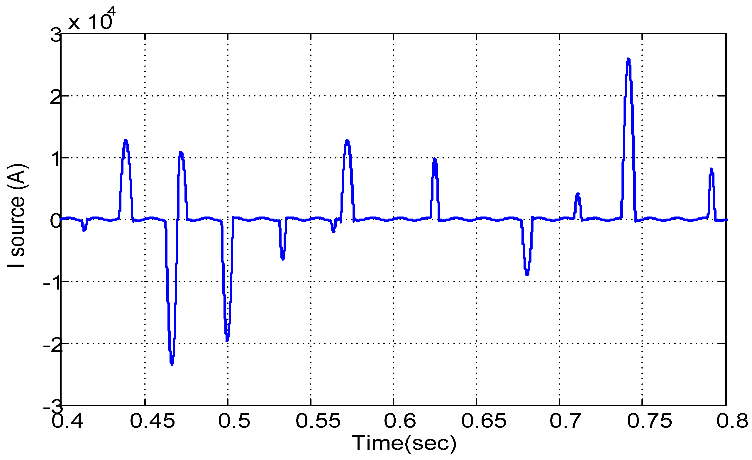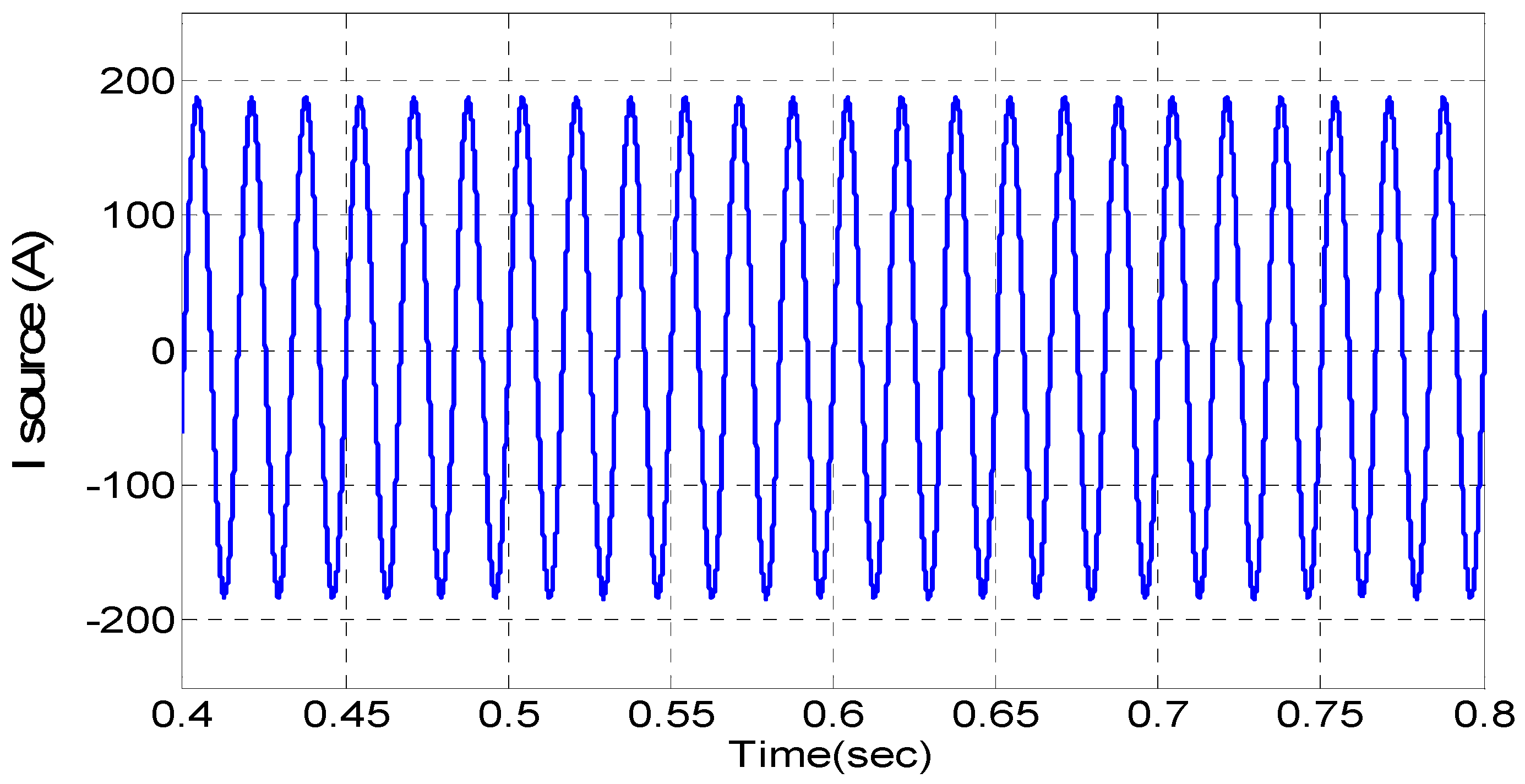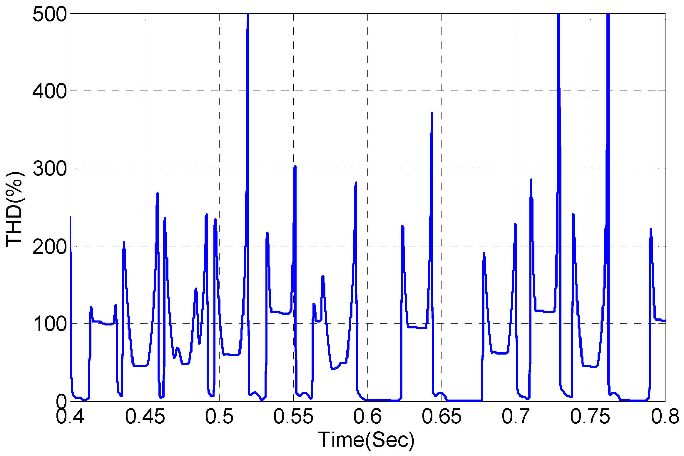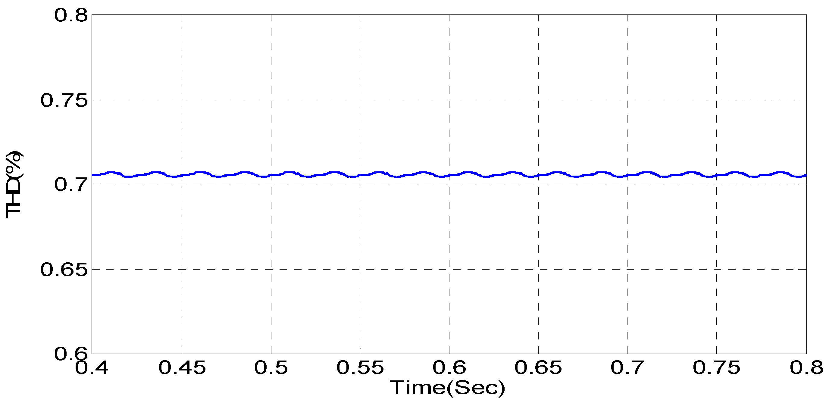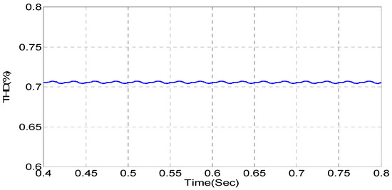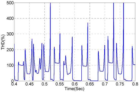 As shown in Figure 19, the current source of the grid is not symmetrical and sinusoidal. Figure 20 shows the THD of the current source, which is not stable, and it is not going to a constant value.