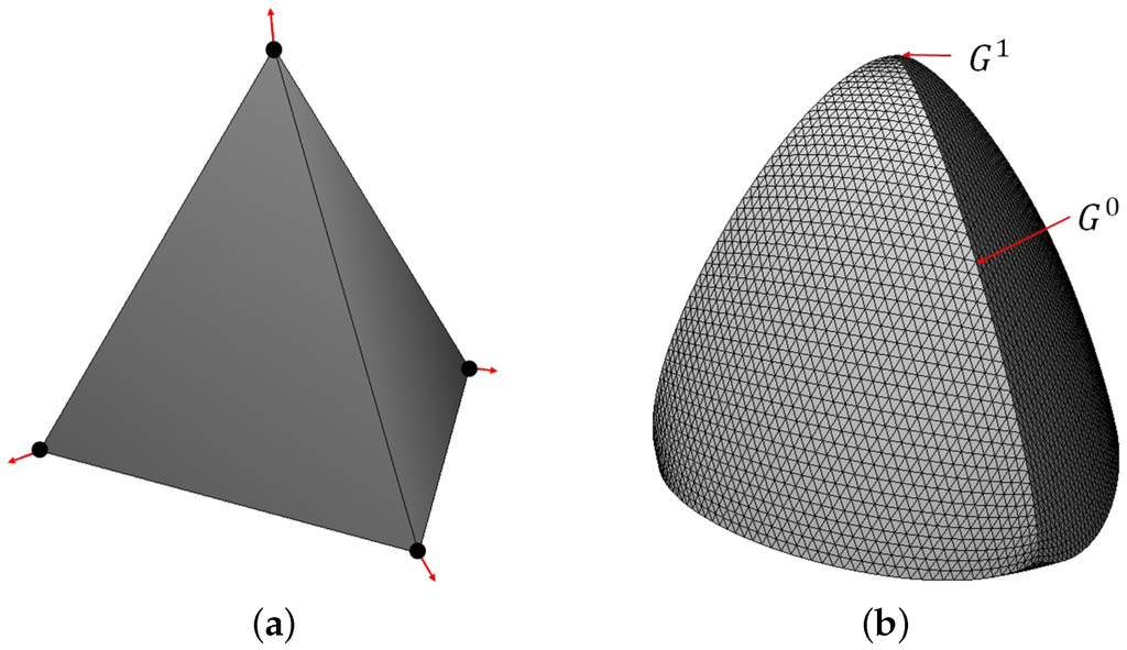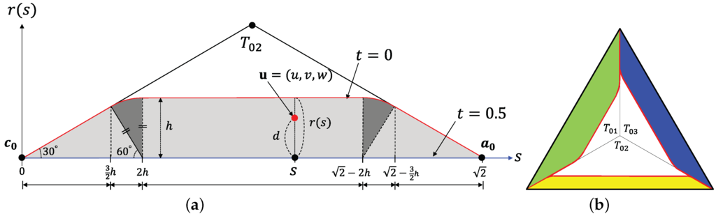 where is the distance between and . Thus, t is 0 outside the blending region, and it varies from 0 to inside the blending region, as shown in Figure 7a. In our method, we can define different blending regions on each edge of a domain triangle by using different values of the user-specified h, as shown in Figure 7b. Sharp edges can easily be created by degenerate case ().