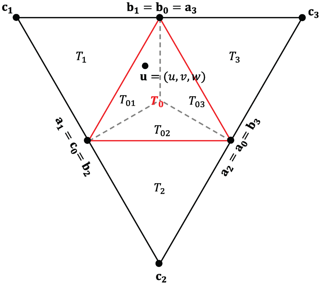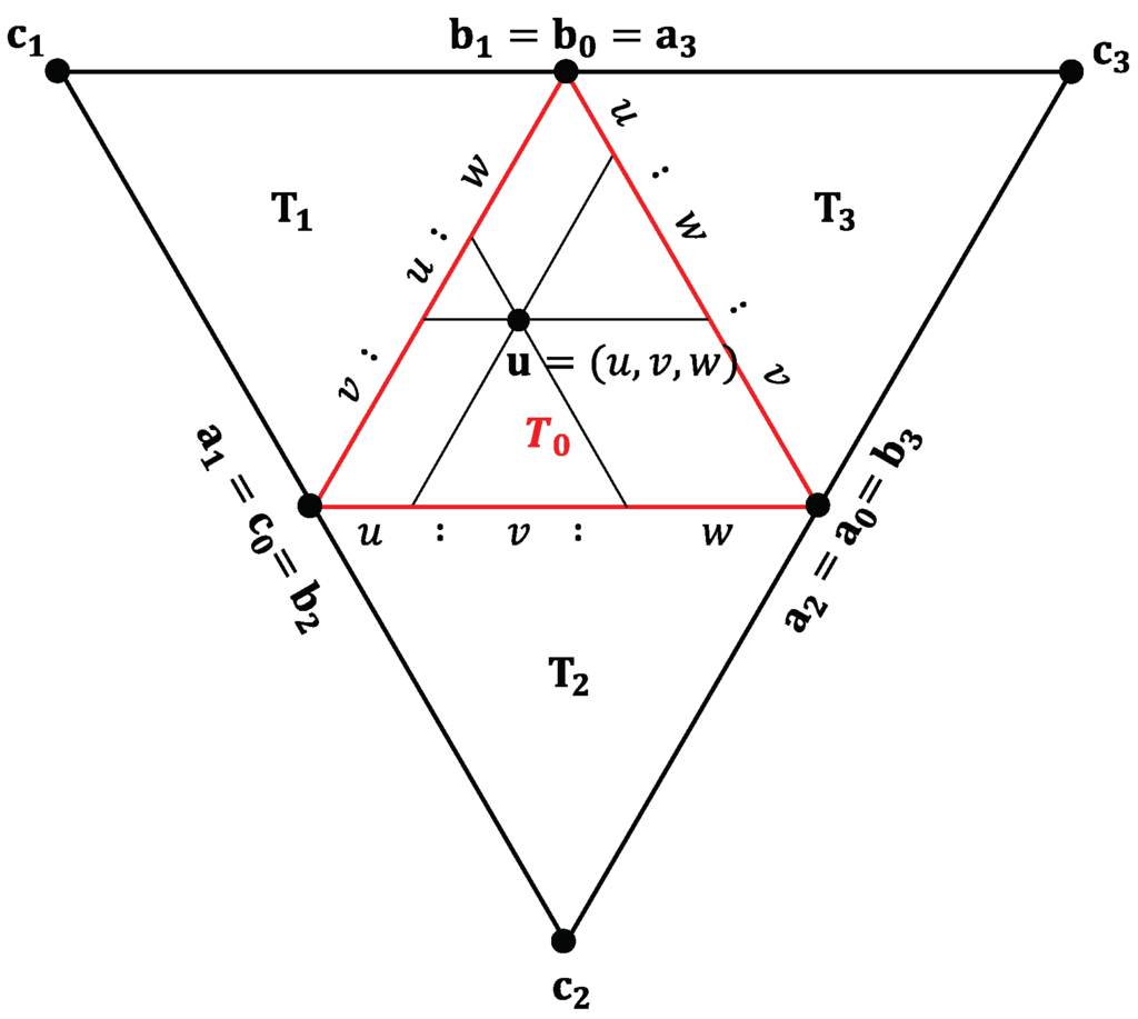 We will now show how to blend two Bézier triangles to achieve continuity across their boundaries. Figure 4 shows four domain triangles , with vertices . We subdivide the domain triangle into three subdomains and . If a point has the barycentric coordinates with respect to , then the subdomain where it lies can be identified by its smallest coordinate:
