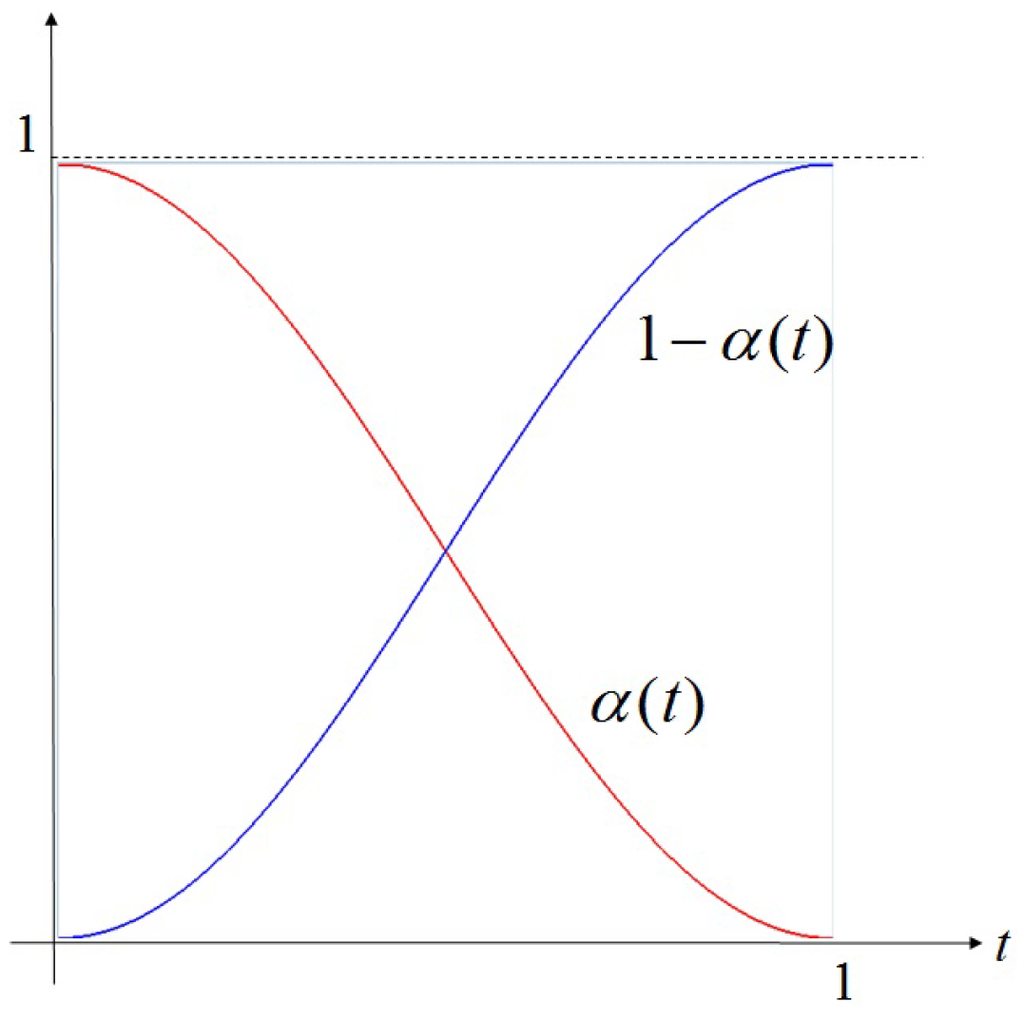 where is a blending function in terms of the parameter t determined by Equation (4). Note that reverts to outside the blending region (the white area in Figure 7b).