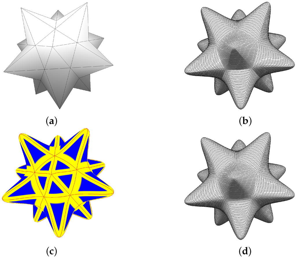 We implemented our technique in C++ on a PC with an Intel Core i7 2.00GHz CPU with 8GB of main memory and an Intel(R) Iris Pro Graphics 5200. Figure 9 shows example blends on the mesh of Figure 3a with extents corresponding to and , and their different blending results are shown in Figure 9b,d, respectively. If we set , we obtain the PN triangles of Figure 3b.