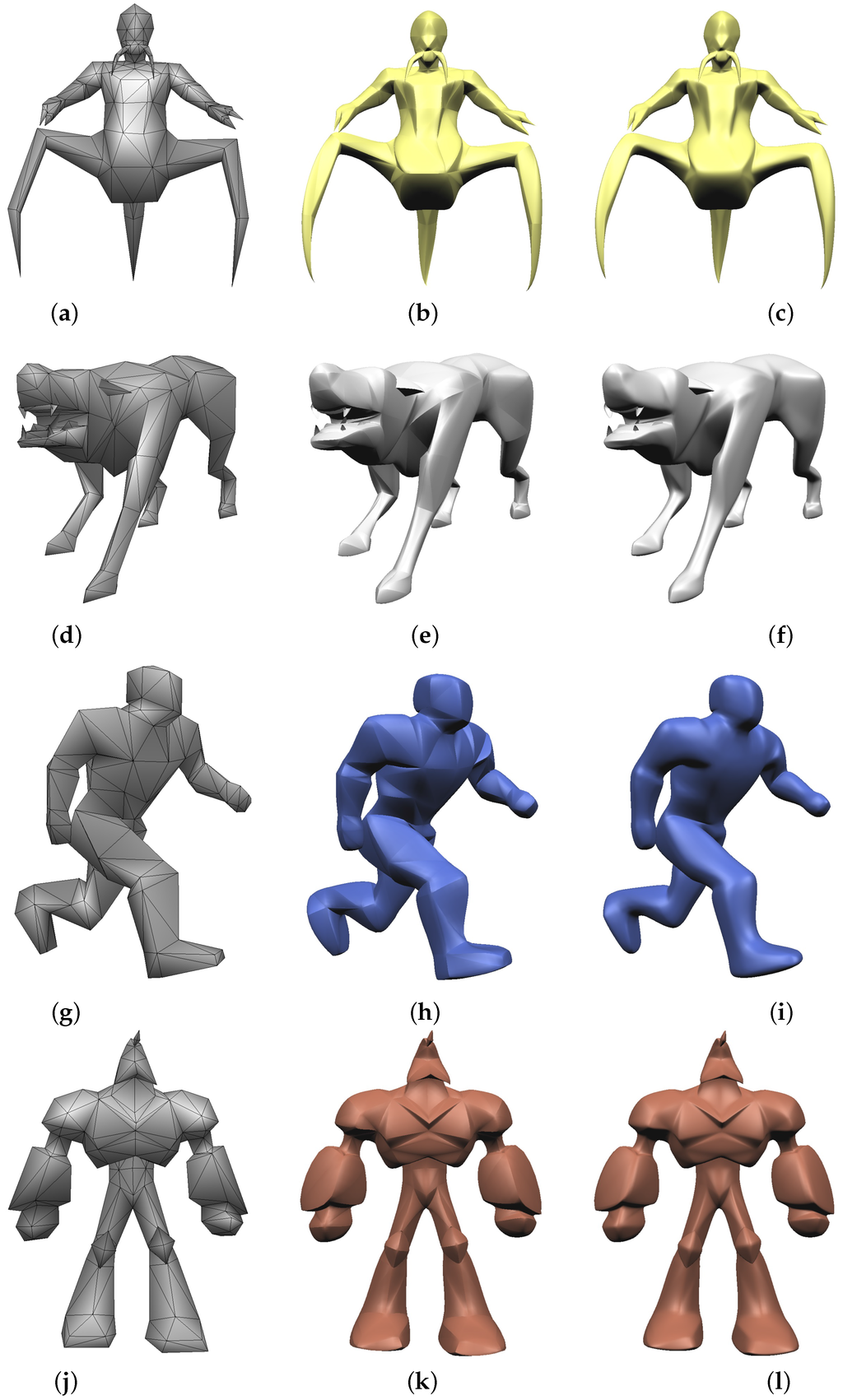 Comparison with PN triangles: (a), (d), (g), (h): control meshes; (b), (e), (h), (k): PN triangles with continuity; (c), (f), (i), (l): smooth surfaces with continuity.