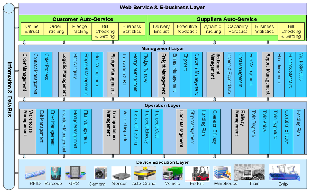 In the business layer structure, the users can do anything with client personal computers or cloud terminals, including mobile phones and PAD. The users are vehicle drivers, operators, and managers from groups, manufacturers, factories, branch companies, procurement buyers, suppliers, banks, steel factories, management department, warehouse centers etc. The users can dispatch vehicles to transport the goods, monitor and manage status of the goods, and finish the financial settlement among the different organizers in the product life cycle at any-time and any-where by all available networks in the cloud platform.