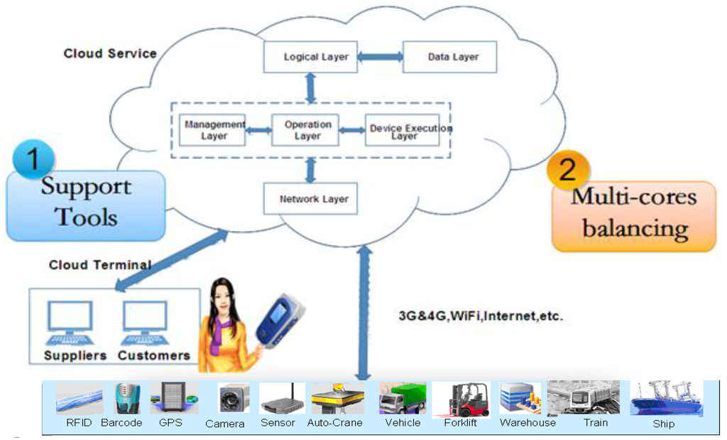 According to the logistics business application service process, the vehicles’ GPS information, driver request messages, sensor information (for example RFID, temperature, pressure, stress, angle), and application tasks in all the terminals are sent to the cloud platform. On the other hand, the control center commands are sent to application terminals by the integrated WAN on 3&4G and Internet (Intranet). Different types of information, including messages, data files and video stream can be sent and received freely and safely via internet. The details of logistics business structure can be seen in Figure 1. The logistics business structure includes Web service & Electronic business layer, management layer, operation layer, and device execution layer. Communication of the different layers depends on the information and data bus to receive and deliver information and data from the different business modules in the cloud service platform.