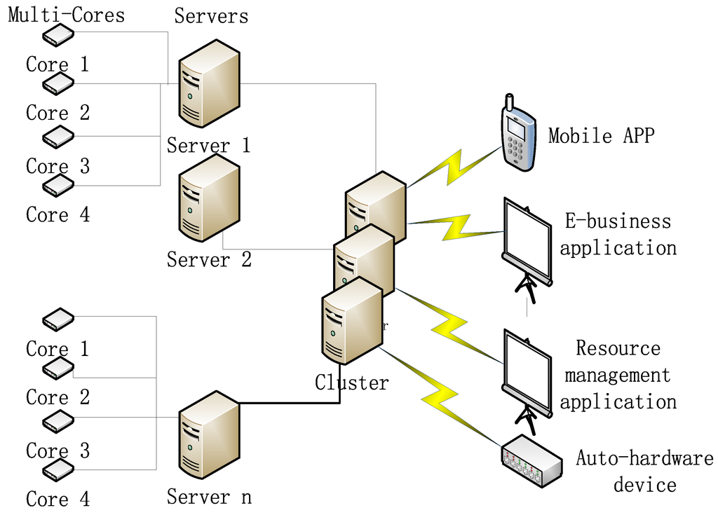 There are many application tasks from smart mobile phones, C/S & B/S clients, and auto-hardware devices including mobile application (APP), electronic business application, and enterprise resource management application. Because information is collected from auto-hardware devices and commands are delivered to execution devices, procedure of data and information are highly concurrent and throughput capacity is very big at any time. In order to improve service performance of cloud platform just in time, a hierarchical structure for business task dispatch is proposed, the first layer is used for assigning application task among servers in the same service cluster; the second layer is charged with dispatching computation resource for one task among multi-cores in a same server. The details of the hierarchical structure for application task dispatch can be seen in Figure 3.