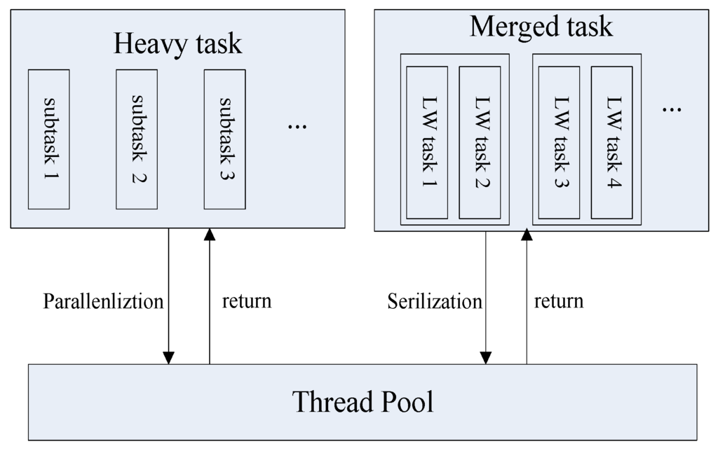 Service requests from clients are likely to handle both heavy tasks and lightweight tasks. If one heavy task is distributed to one thread, it would cause load un-balanced. Analogously, too many lightweight tasks that each one occupies a thread would increase high system cost [24,25]. Thus tasks executed in threads should be controlled in a suitable size. A method of task size controlling is used to balance load of multi-cores with parallelizing heavy tasks and serializing light-weight (LW) tasks as Figure 6. Because serialization of the lightweight tasks is relatively easy to attain, it just waits for enough tasks to arrive and fetches a thread from the thread pool to execute the tasks, thus we only discuss the heavy task parallelization. The task scheduling algorithm is based on Java Fork/Join framework and classic task scheduling algorithm.