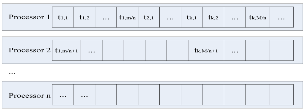 I. For task Tj, the parallel subtasks tj,1,tj,2 … tj,m are distributed evenly to all task queues, so each queue has m/n parallel tasks. Tasks with higher priorities are queued earlier than other tasks. Thus the distribution of parallel tasks is obtained and is presented in Figure 8.