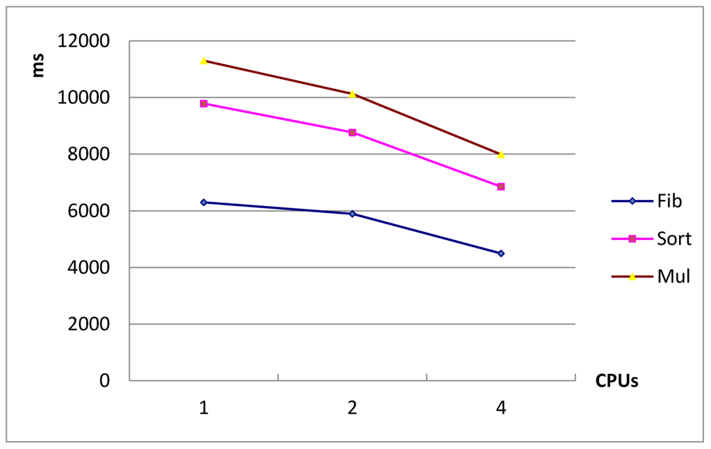 In order to verify system performance, an experiment is done to test the task scheduling algorithm in load balancing and utilizing multi-core processors. It compares the results of task execution with one core, two cores, and four cores. We adopt three types of classic tasks for test, they are the Fibonnaci program with argument 40 (Fib), quickly sorting of 20,000 integers (Sort) and multiplication of 512-bit and 512-bit integer (Mul). All three types have the same priority. For each type of task, number of subtasks executed on cores and the total execution time was gathered. The tasks are executed 10 times and the results are averaged. The results are presented in Table 1 and Table 2 and Figure 9.