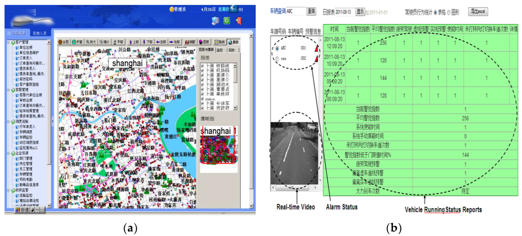 The details of the logistics business cloud service and the algorithm application can be seen as Figure 10. There are logistics business operation and management service functions in the left, geographic information system (GIS) map in the middle, and map layer management in the right in Figure 10a. There are real-time video and alarm status in the left, and vehicle running status reports in the right in Figure 10b. The management and monitor service requests from operators and sensors are taken place in high concurrency, which must be dealt with by the task scheduling algorithm among the clustering servers and the load balancing algorithm among multi-cores in the cloud service platform.