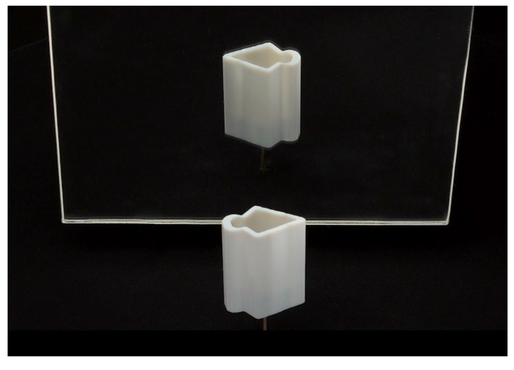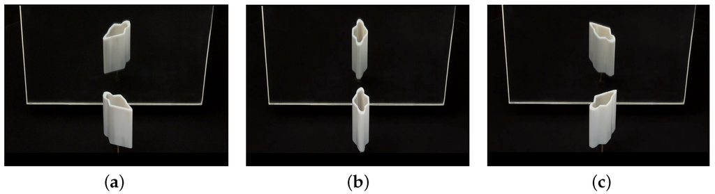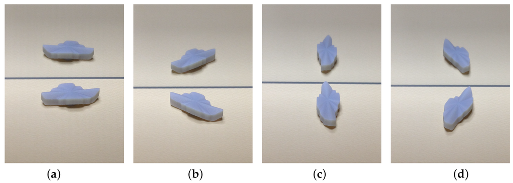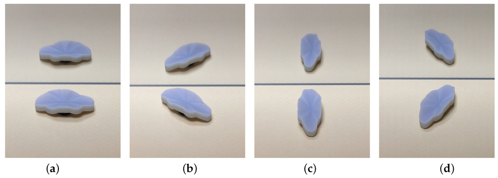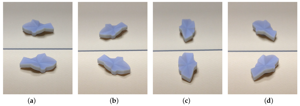 Figure 8a is a picture of the resulting solid in the original posture and its mirror image. The panels (b), (c) and (d) of this figure show the same object rotated around a vertical axis clockwise step by step in this order.