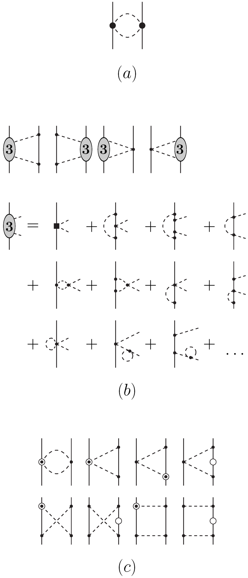 More 2PE is produced at , next-to-next-to-next-to-leading order (NLO), of which we show only a few symbolic diagrams in Figure 1. There is a large attractive one-loop 2PE contribution (the bubble diagram with two large solid dots ), which is slightly over-doing the intermediate-range attraction of the 2NF. Two-loop 2PE graphs show up for the first time and so does three-pion exchange (3PE) which necessarily involves two loops. 3PE was found to be negligible at this order [30,31]. Most importantly, 15 new contact terms arise and are represented by the four-nucleon-leg graph with a solid diamond. They include a quadratic spin-orbit term and contribute up to D-waves. Mainly due to the increased number of contact terms, a quantitative description of the two-nucleon interaction up to about 300 MeV lab. energy is possible, at NLO [15,32]. Besides further 3NF, four-nucleon forces (4NF) start at this order. Since the leading 4NF come into existence one order higher than the leading 3NF, 4NF are weaker than 3NF. Thus, ChPT provides a straightforward explanation for the empirically known fact that 2NF ≫ 3NF ≫ 4NF ….