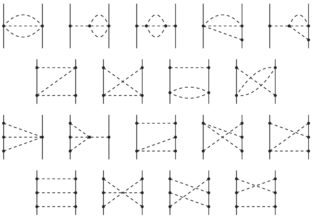 where the superscript denotes the order ν of the expansion and the ellipses stand for contributions of seventh and higher orders. Due to parity and time-reversal, there are no first order contributions. Moreover, since n pions create loops, the leading order for n-pion exchange ocurrs at (cf. Equation (27)).