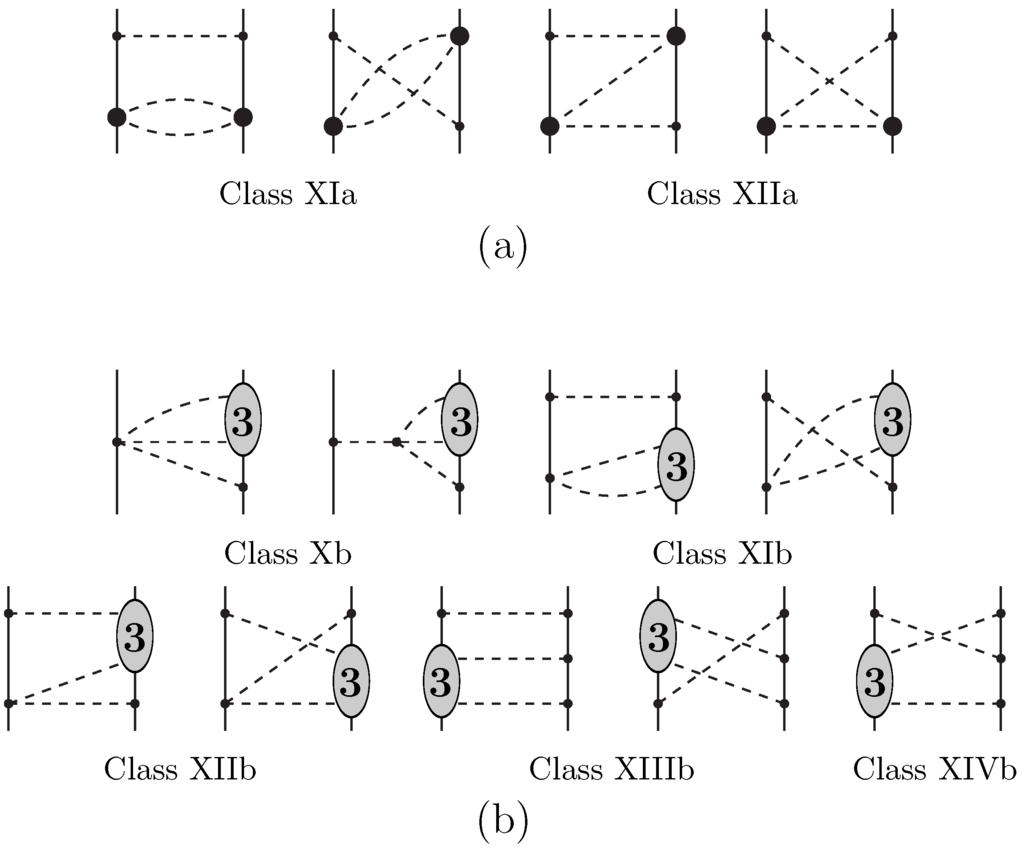 Moreover, the power formula Equation (25) allows to predict the leading orders of connected multi-nucleon forces. Consider a m-nucleon irreducibly connected diagram (m-nucleon force) in an A-nucleon system (). The number of separately connected pieces is . Inserting this into Equation (25) together with and yields . Thus, two-nucleon forces () start at , three-nucleon forces () at (but they happen to cancel at that order), and four-nucleon forces at (they don’t cancel). More about this in the next sub-section.