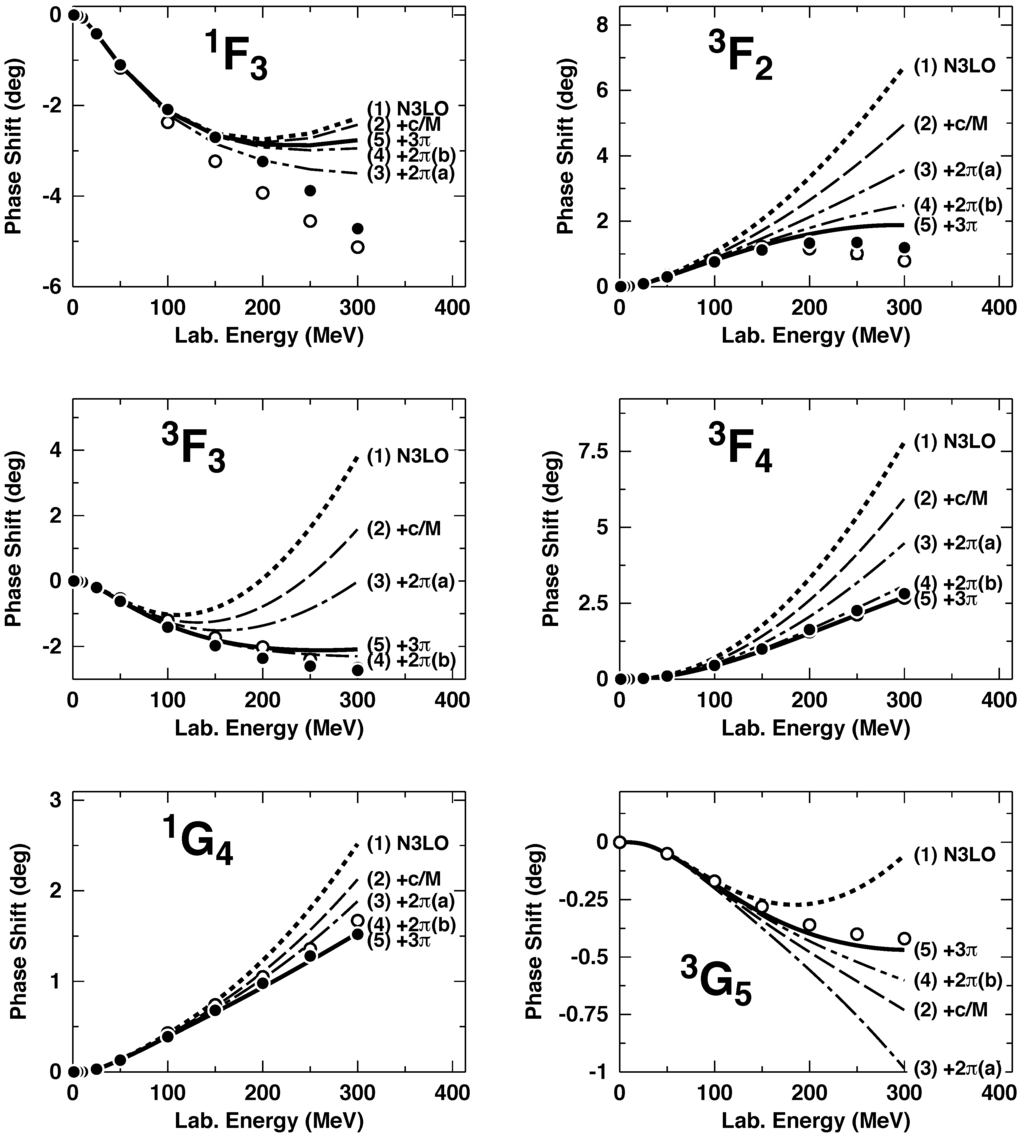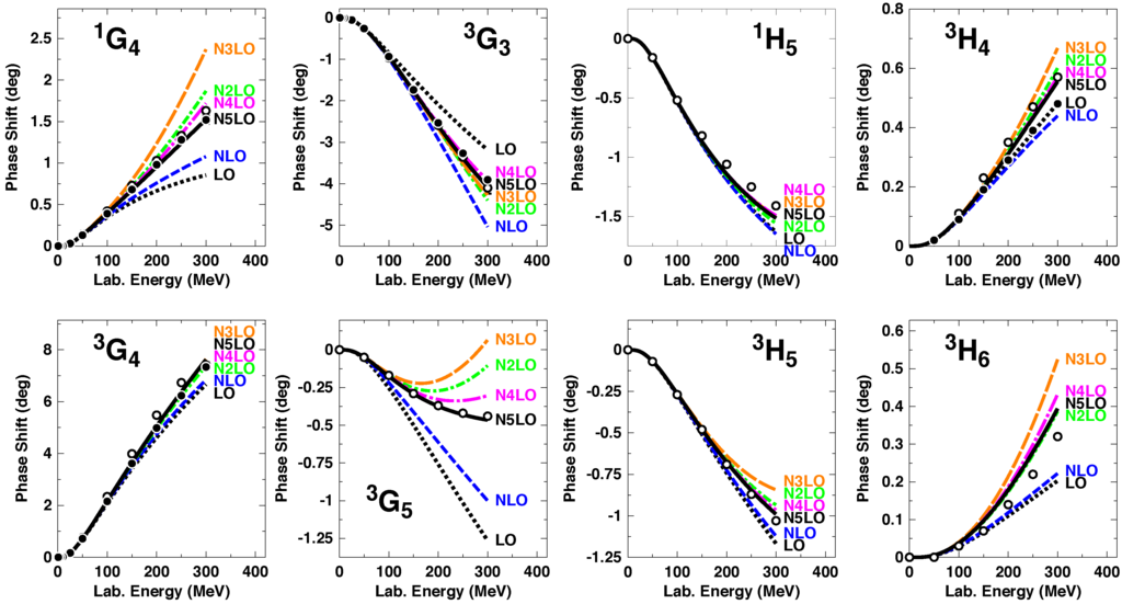 Finally turning to NLO (sixth order): The dominant 2PE and 3PE contributions to the 2NF have been derived by Entem et al. in Ref. [35], which represents the most sophisticated investigation ever conducted in chiral EFT for the system. The effects are small indicating the desired trend towards convergence of the chiral expansion for the 2NF. Moreover, a new set of 26 contact terms that contribute up to F-waves occurs (represented by the diagram with a star in Figure 1) bringing the total number of contacts to 50 [36]. The three-, four-, and five-nucleon forces of this order have not yet been derived.