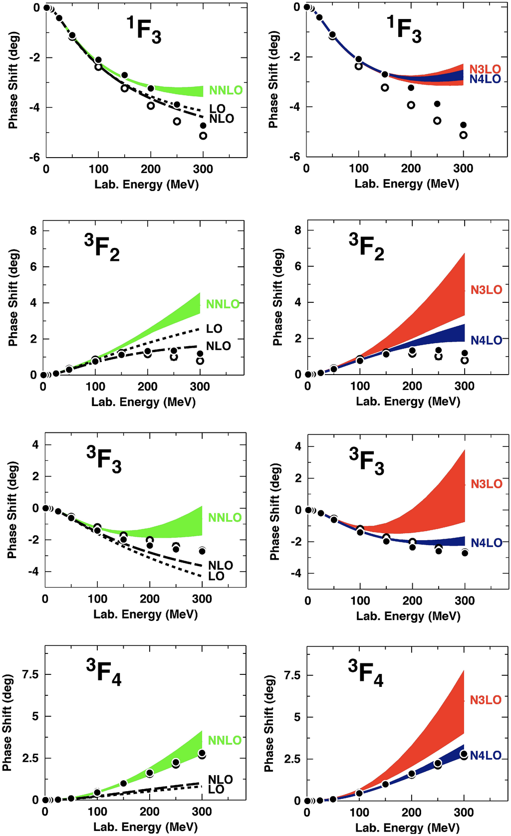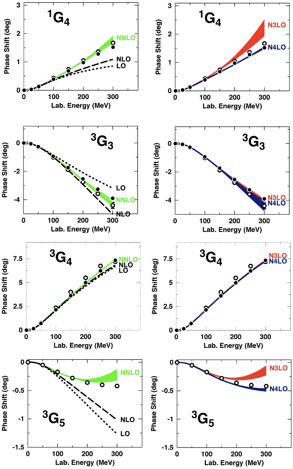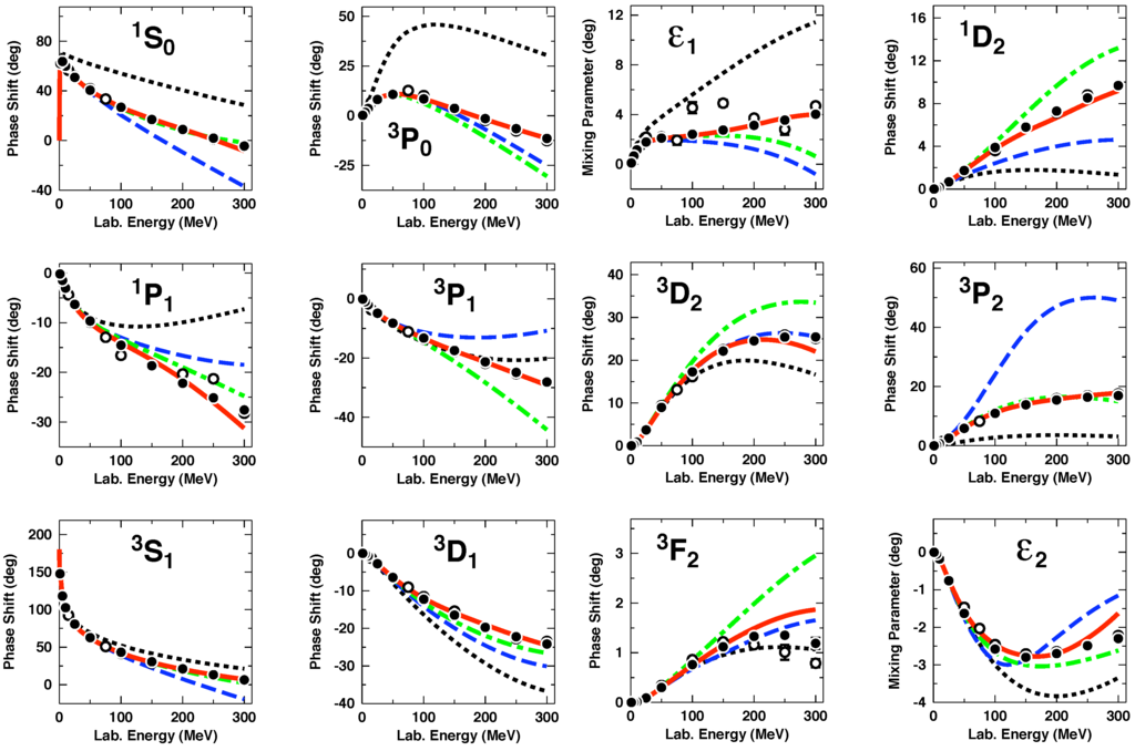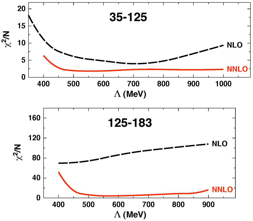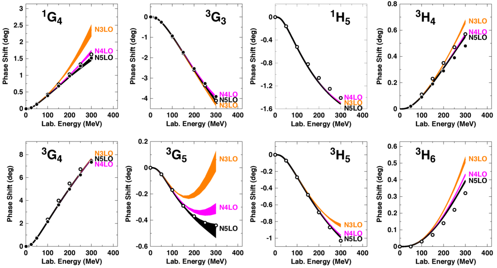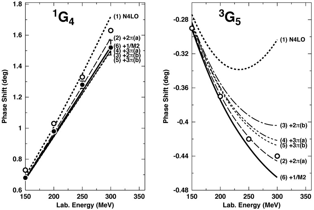 Turning now to NLO: Based upon the derivation of the 2PE and 3PE contributions to the interaction at NLO by Entem et al. [33] presented in Section 4.5 and applied in peripheral scattering in Section 5, potential at NLO have recently been developed [33,87]. Note that the lower partial waves, which are crucial for a quantitative reproduction of the data, are ruled by the contact terms. The number of contacts at NLO () is the same as at NLO (). Thus, the NLO potentials are not very different from the NLO ones. Note also that the high quality of some of the NLO potentials [15,32] leaves little room for improvements.