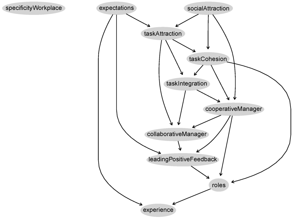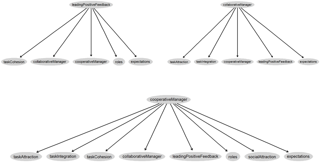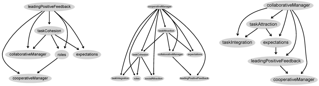 Up to this point, we obtain the probabilistic models factorized according to the TAN models, which are special types of BNs; see Figure 3. The independence of the social attraction and leading positive feedback features given the roles and cooperative manager features is shown in the center of Figure 3; reciprocally by symmetry, leading positive feedback is independent of the social attraction given the roles and cooperative manager features. Similarly, on the right side of Figure 3, cooperative manager and task integration appear as independent features given the collaborative manager and task cohesion features.