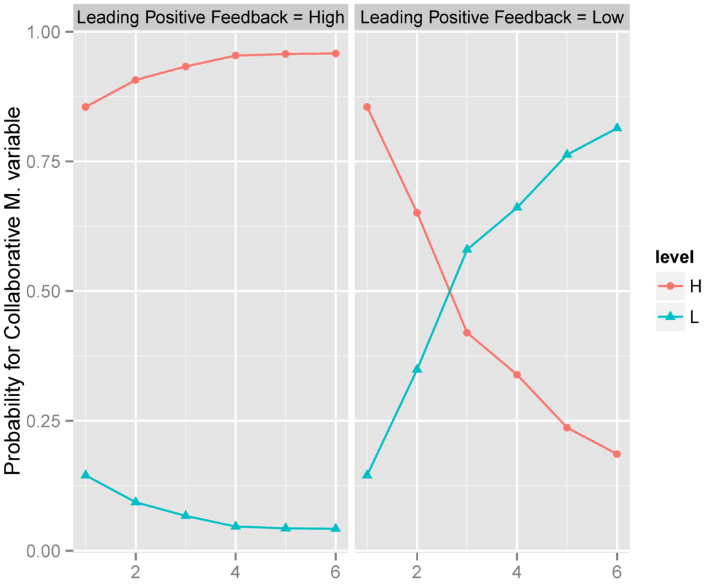 The TAN classifier [38] extends the NB model with a tree-shaped graph across the predictor variables. The TAN model is similar to NB, except that each predictor variable is allowed to depend on other predictor variables in addition to the class. Figure 3 shows three models that we have learned for leading positive feedback, cooperative manager and collaborative manager (see also Listing 3). This model provides more information than the NB model, as it included information about the relationship among all predictor variables.