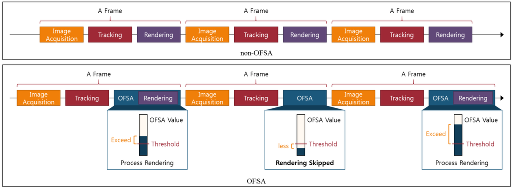 Figure 2 shows non-OFSA and OFSA processing in an AR implementation through smart devices. Non-OFSA refers to an AR implementation scheme without OFSA application, following the process flow of the Vuforia API [18]. The process flow of AR implementation in the non-OFSA environment can be divided into three stages: image acquisition, in which the image is received from the input device, such as the camera; tracking, which derives the target object from the received image and computes the camera pose matrix; and rendering, which creates the AR object in an appropriate form on the current frame based on the camera pose matrix. In this process, OFSA comes after tracking and uses the camera pose matrix computed in the tracking process. OFSA not only determines whether or not rendering should be performed, but also stores a snapshot of the AR object after the rendering. Hence, the rendering process is included in OFSA. In contrast to non-OFSA, OFSA performs an additional process for each frame. However, it stores the OFSA value of the key frame and compares the OFSA value in each frame to reduce the load on the processor based on this computation. As such, the processor overload rate decreases by omitting the rendering of meaningless frames, achieving a higher frame rate. As the omitted frames have very small changes in camera pose, which users cannot visibly detect, an identical AR service can be provided without being restricted by the computing power.