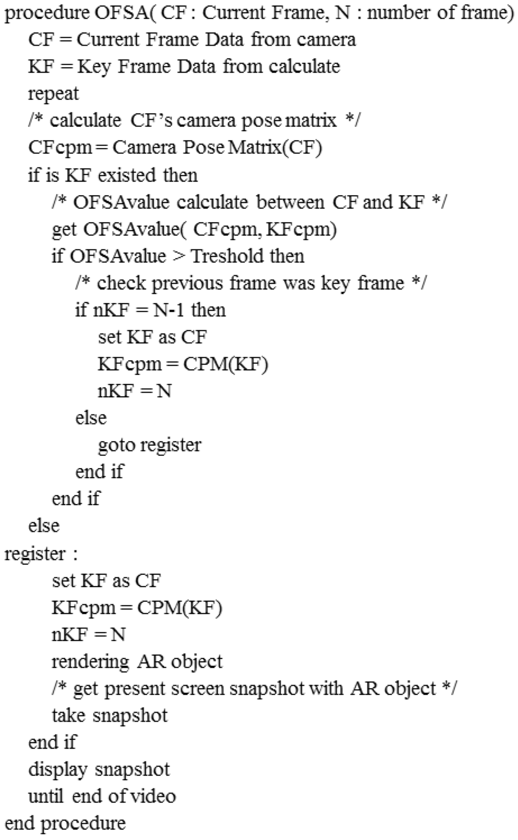 OFSA, as proposed in this paper, compares the current frame to the previous frame and omits rendering when the movement of the AR object is below the threshold. As a result, the level of processing decreases, improving the frame rate. As more frequent image acquisition and tracking becomes possible, more seamless AR can be provided to users. OFSA computes a camera pose matrix based on a target object recognized in the frame and categorizes frames that require rendering and frames that do not. By comparing the current frame and the key frame, it categorizes frames with significant movement as requiring rendering and those without significant movement as useless and not requiring rendering. The criteria of significant movement are determined according to a user-selected threshold. The fact that a camera pose matrix that constantly changes according to the movement of the camera does not result in a significant difference between the current frame and the key frame indicates that the change in the rotation angle and the location of the AR object is small.