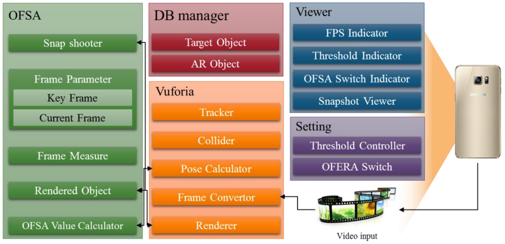 Vuforia consists of Frame Converter; Tracker, which detects the target object from the converted image data; Collider, for multi-target AR; Pose Calculator, which computes the camera pose matrix of the frame using the recognized target object; and Renderer, for the rendering of AR objects. OFSA consists of Snap Shooter, which stores images in memory to display the rendered object in useless frames without an additional rendering process; Frame Parameter, which stores the parameters of each frame for comparisons between key frames and current frames; Frame Measure, which processes the comparison computation of OFSA values; Rendered Object, which stores the completely rendered object in case rendering is processed after the renewal of the key frame; and OFSA Value Calculator, which computes the OFSA value using the data from Frame Converter. DB manager stores the model and object required for AR implementation and includes the AR object, which stores the rendered AR object, and the target object, which stores information about a real object, onto which the relevant object will be overlaid. Viewer provides the user interface (UI). It consists of FPS Indicator, which directly compares the frame rate between OFSA and non-OFSA; Threshold Indicator, which checks the threshold value of the current user setting; OFSA Switch Indicator, which checks the setting of OFSA and non-OFSA; and Snapshot Viewer, which displays snapshots of the OFSA process. Setting determines and stores the detailed OFSA settings. The setting interface includes Threshold Controller, which determines the snapshot in the OFSA process according to the difference in camera poses between the current frame and the key frame, and OFSA Switch, which switches between the implementation of non-OFSA and OFSA.