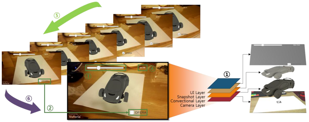 Figure 5 exhibits the composition of mo_OFSA implemented for the performance measurements of OFSA. Its structure features four overlaid layers, which are described in ① of Figure 5. The first layer is the camera layer, where the image received from the camera is displayed. The second layer is the convectional layer, which displays the target object that was recognized by non-OFSA on the AR object. The third layer is the snapshot layer, which displays the snapshot stored by OFSA. The fourth layer is capable of performing switches between non-OFSA and OFSA in the adaptive OFSA environment without additional processes, as it consists of the user interface (UI) layer. Figure 5 ② shows a checkbox for switching between OFSA and non-OFSA, where AR is implemented by non-OFSA if unchecked, while the adaptive OFSA process is applied if checked. Figure 5 ③ shows an indicator for controlling the threshold of OFSA, where the sensitivity of OFSA is set. The initial value is 30, and mo_OFSA supports a control range between zero and 100. Figure 5 ④ shows an FPS indicator, which presents the frame rate of mo_OFSA as a 0.5-s renewal and records it for AR service analysis. Figure 5 ⑤ shows the actual application screen for when the change of camera pose is smaller than the threshold in the OFSA environment. Although there is a minute change in the angle of the camera view, the AR object is maintained as the identical model through the snapshot, and the FPS also shows the same level as under the idle condition. Figure 5 ⑥ shows a case of the camera pose change being larger than the threshold in the OFSA environment. A new object that is different from the AR object in Figure 5 ⑤ is rendered to be registered in the snapshot and displayed.