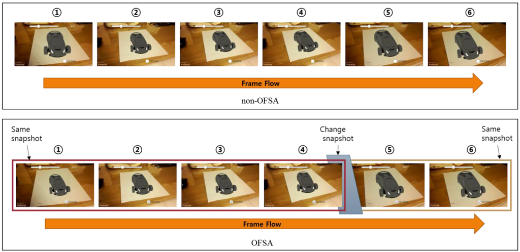 Figure 6 shows frame flow, which checks the frame selection of OFSA using mo_OFSA. An image was used in which the camera moved while centered on the target object. Each frame has a 1-s distance in the image, which shows how the AR model is processed in non-OFSA and OFSA environments. In non-OFSA, the AR model was rendered in each frame according to the frame flow. In OFSA, ①, ②, ③ and ④ in Figure 6 display identical AR models using a single snapshot. This is because the difference in the camera pose matrix among the four frames from ① is small. However, ⑤ and ⑥ in Figure 6 are displayed by storing the snapshot that differs from the previous one after detecting a change in the camera pose matrix that exceeds the threshold.