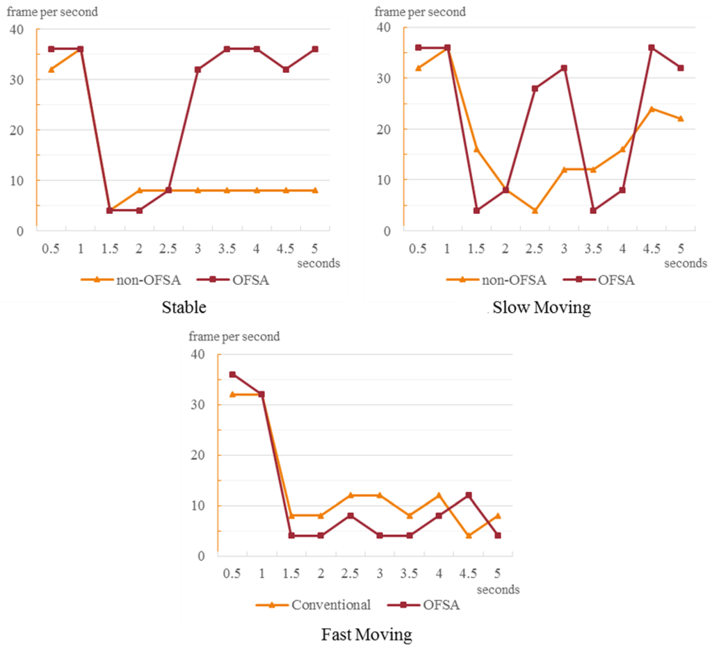Figure 7 shows the average and median FPS of non-OFSA and OFSA observed in the same 5-s image length on a graph. As shown in Figure 7 for Stable, OFSA is tracking and rendering the target object through recognizing the interval [1–1.5 s]. Additionally, in the next step, OFSA can keep the same FPS, prior to the target object without the tracking and rendering step. For Slow Moving in Figure 7, the target object should be placed from the camera at a greater distance in Stable. Therefore, it can speed up the time more than Stable by using a few of polygons without a rendering step. OFSA experiences a small frame drop because of the process for storing snapshots compared to non-OFSA in [1–1.5 s]. Furthermore, it can keep the initial FPS in [1.5–3 s], which does not exceed the threshold value of OFSA regarding the moving of the target object. For Fast Moving in Figure 7, OFSA has to save each new frame of the snapshot within the threshold value of the moving target object for each frame. Therefore, non-OFSA has a large value of frame drop for the total interval in order to solve the adaptive operation.