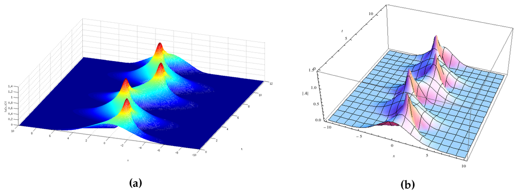 - Al Khawaja, U. A comparative analysis of Painlevé, Lax Pair and similarity transformation methods in obtaining the integrability conditions of nonlinear Schrödinger equations. J. Phys. Math. 2010, 51. [Google Scholar] [CrossRef]