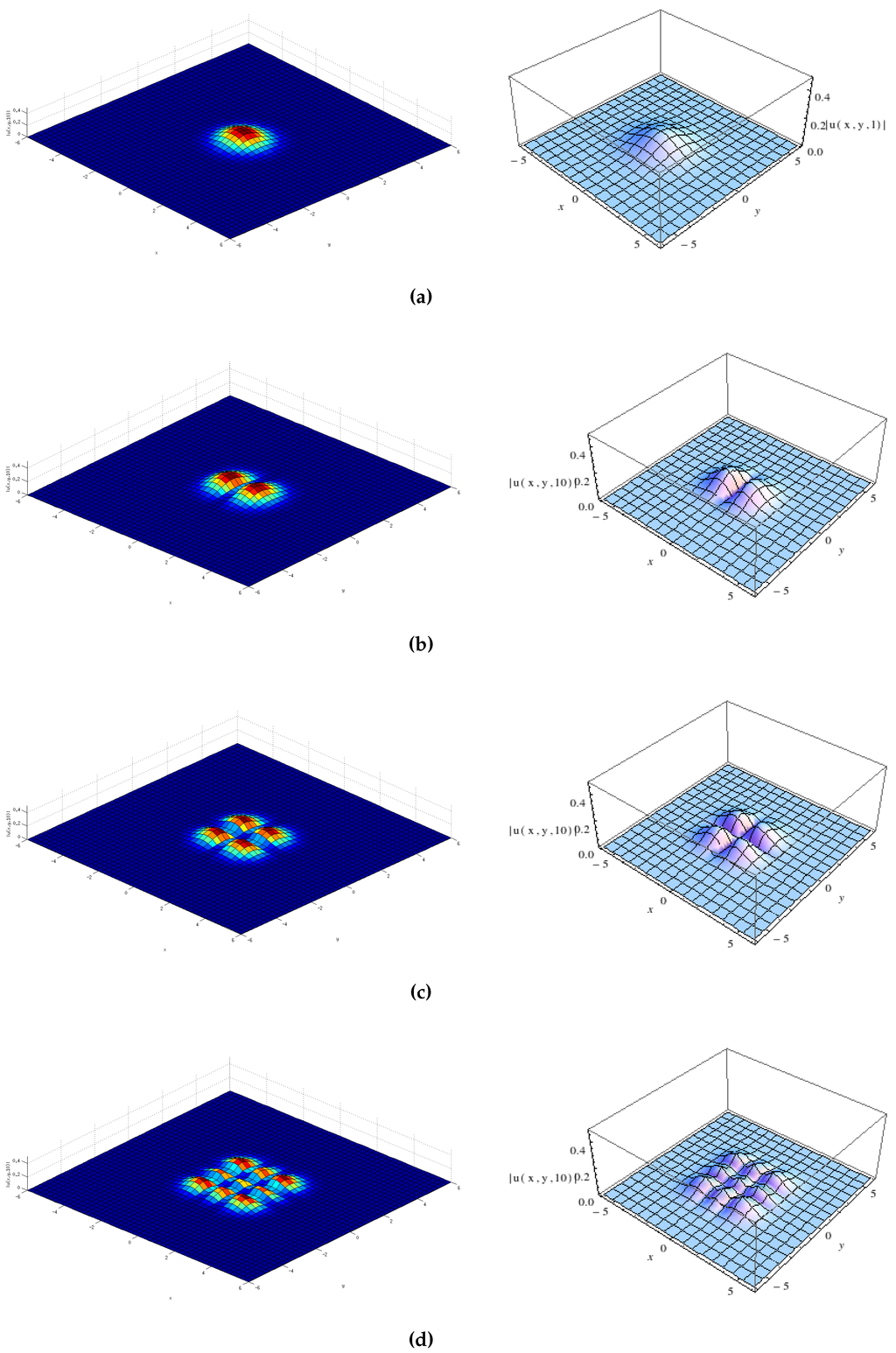 Figure 3 shows four profiles of two-dimensional Hermite-Gaussian beams considering and . The corresponding step sizes are and .