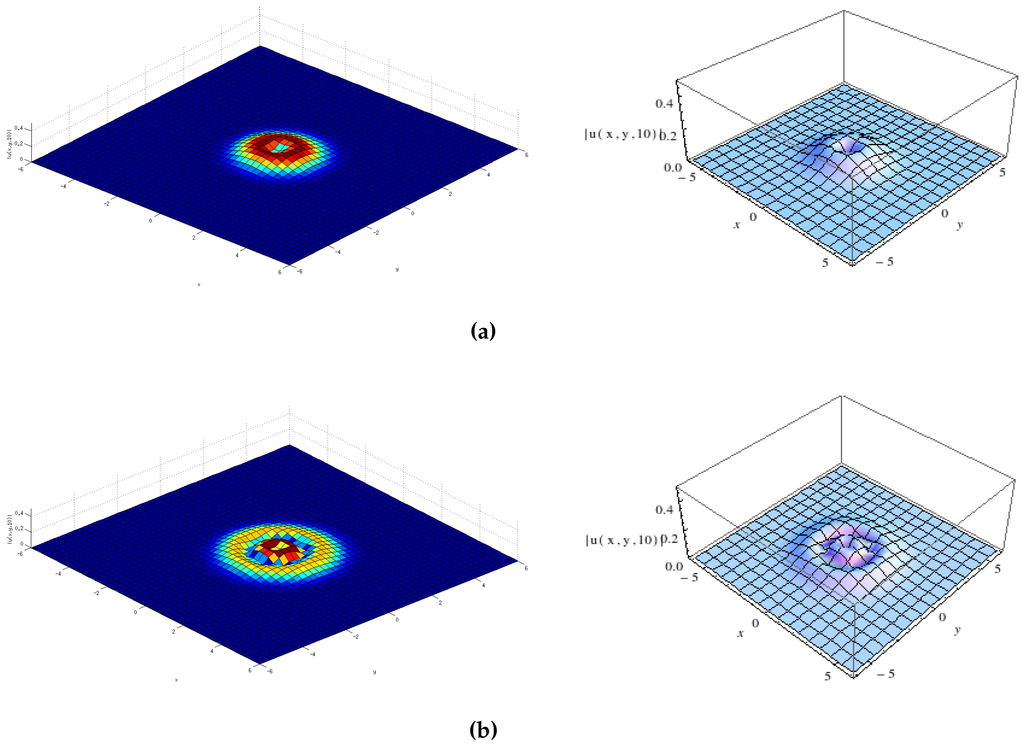 (Left): corresponding approximations for the two-dimensional Laguerre–Gaussian beams with . The initial conditions are (a) ; (b) . (Right): the exact solutions for the two-dimensional Laguerre–Gaussian beams with and parameters .