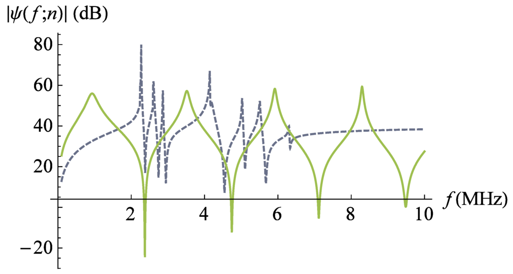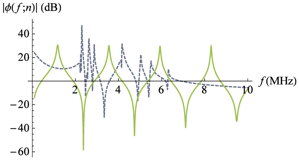 Non-dimensionalised reception sensitivity (Equation (10)) versus frequency for the lattice transducer at fractal generation level (dashed line). The non-dimensionalised reception sensitivity of the standard (Euclidean) transducer is plotted for comparison (full line). Parameter values are given in Auld [] for PZT-5H.