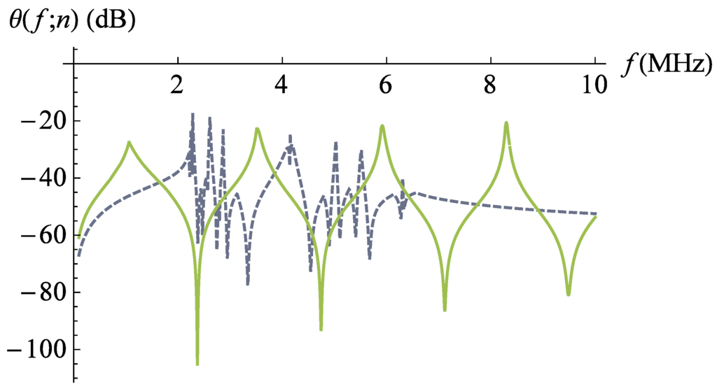 Non-dimensionalised transmission sensitivity (Equation (9)) versus frequency for the lattice transducer at fractal generation level (dashed line). The non-dimensionalised transmission sensitivity of the standard (Euclidean) transducer is plotted for comparison (full line). Parameter values are given in Auld [] for PZT-5H.