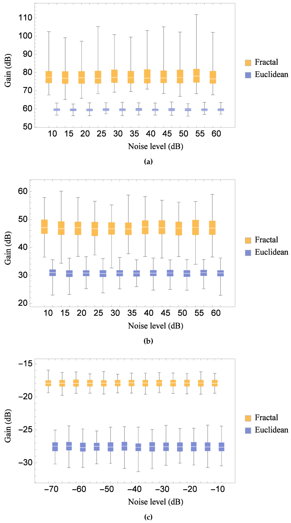 Comparison of the distribution of the maximum gain at various noise levels for the Sierpinski gasket lattice transducer at fractal generation level and the standard (Euclidean) transducer, as all key material parameters are subjected to a random perturbation: (a) for the transmission sensitivity; (b) for the reception sensitivity; and (c) for the pulse-echo sensitivity. Parameter values are given in Auld [] for PZT-5H.