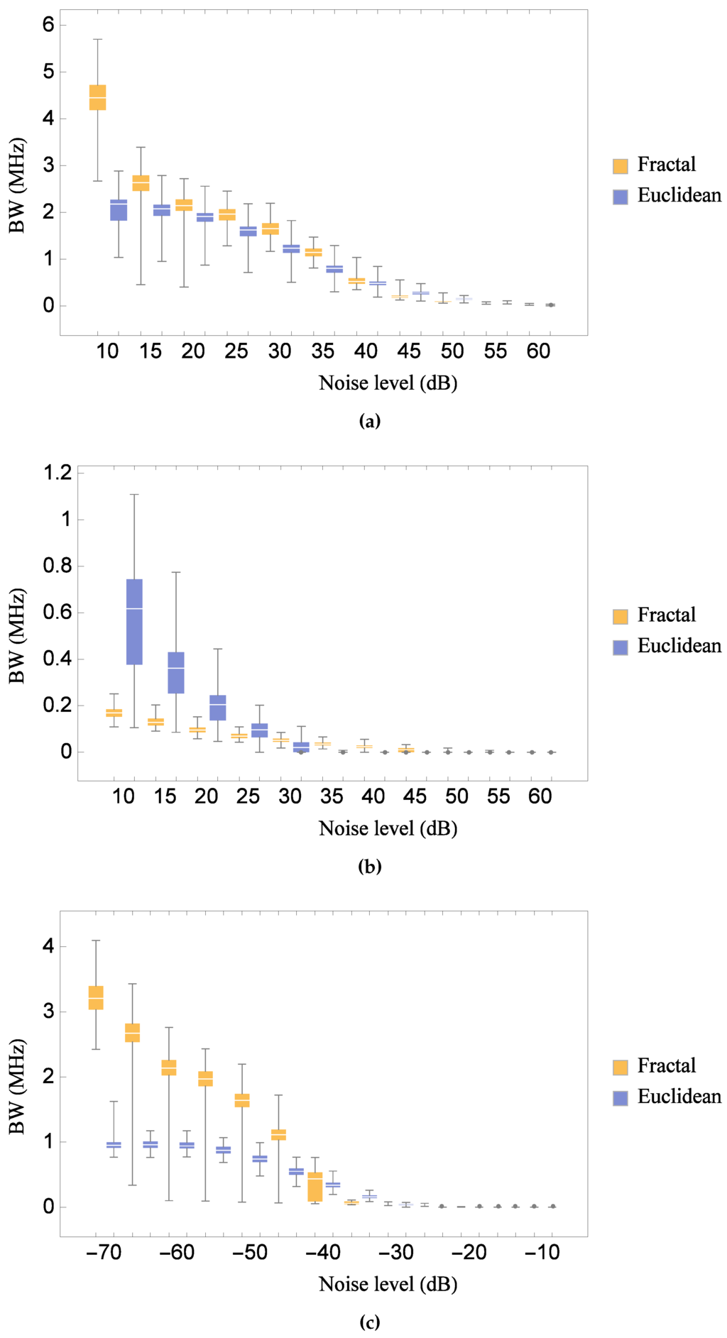 Comparison of the distribution of the bandwidth at various noise levels for the Sierpinski gasket lattice transducer at fractal generation level and the standard (Euclidean) transducer, as all key material parameters are subjected to a random perturbation: (a) for the transmission sensitivity; (b) for the reception sensitivity; and (c) for the pulse-echo sensitivity. Parameter values are given in Auld [] for PZT-5H.
