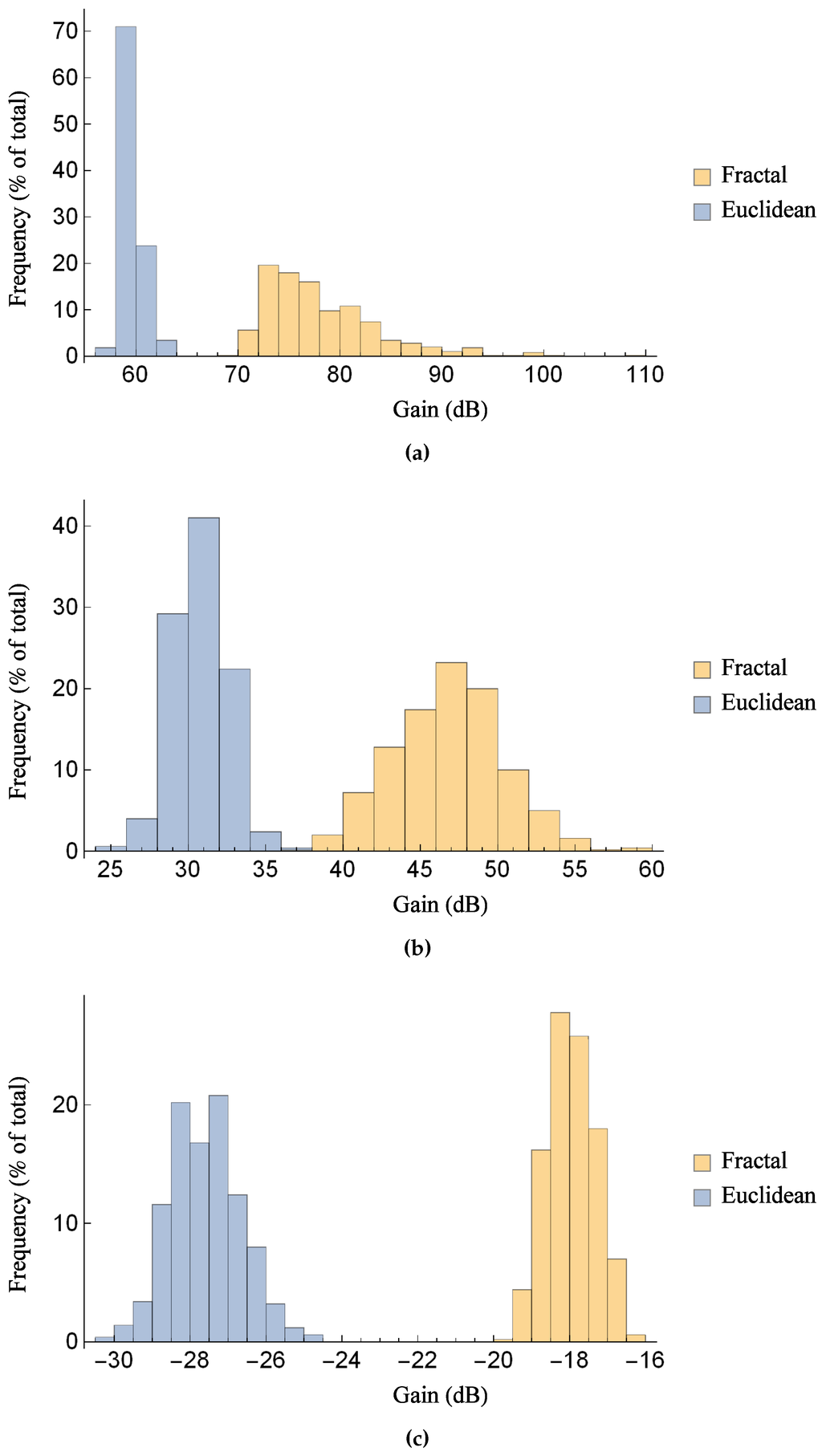 Comparison of the distribution of the maximum gain between the Sierpinski gasket lattice transducer at fractal generation level and the standard (Euclidean) transducer, as the key material parameters are subjected to a random perturbation: (a) for the transmission sensitivity at a noise level of 30 dB; (b) for the reception sensitivity at a noise level of 30 dB; (c) for the pulse-echo sensitivity at a noise level of dB. Parameter values are given in Auld [] for PZT-5H.