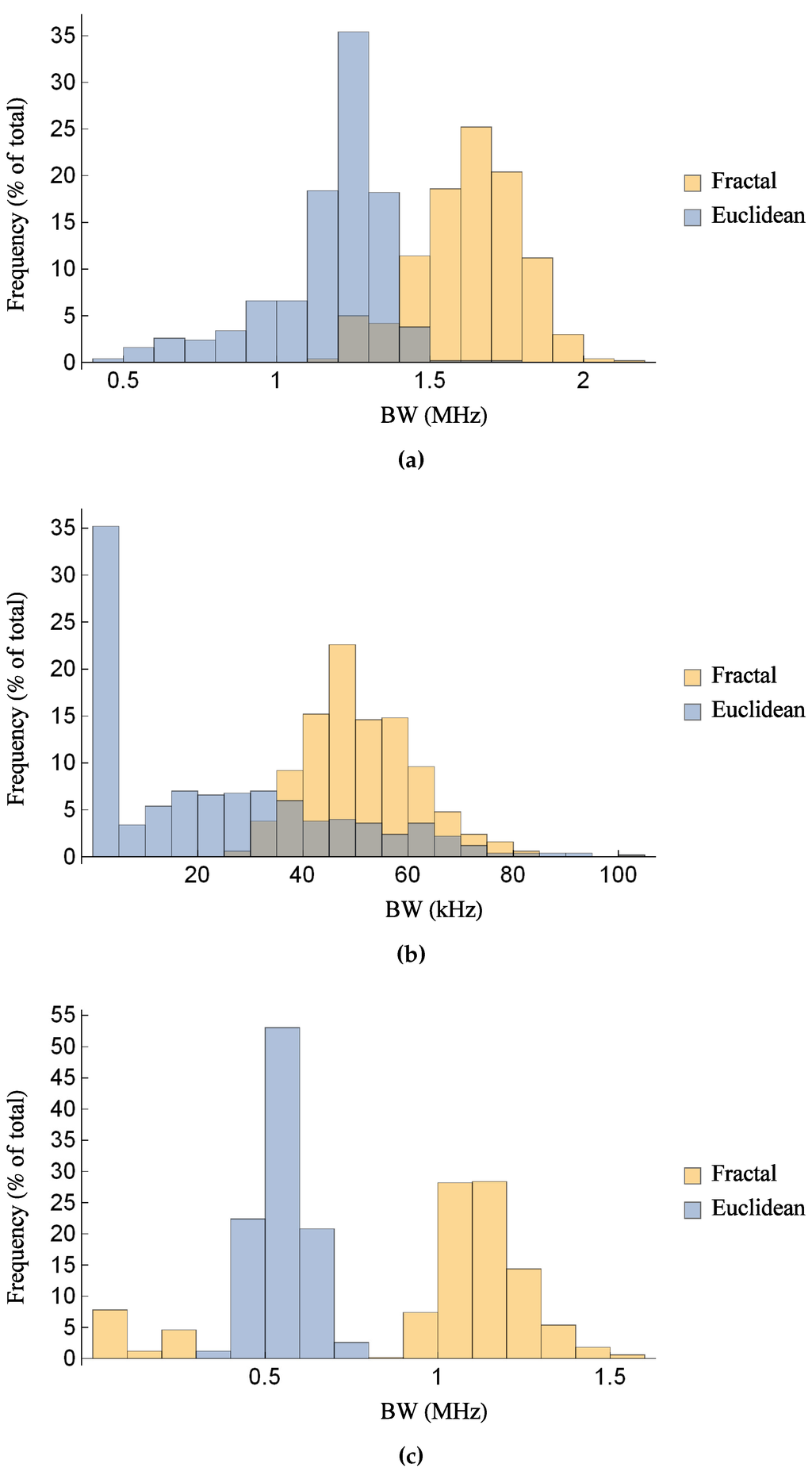Comparison of the distribution of the bandwidth between the Sierpinski gasket lattice transducer at fractal generation level and the standard (Euclidean) transducer, as the key material parameters are subjected to a random perturbation: (a) for the transmission sensitivity at a noise level of 30 dB; (b) for the reception sensitivity at a noise level of 30 dB; and (c) for the pulse-echo sensitivity at a noise level of dB. Parameter values are given in Auld [] for PZT-5H.